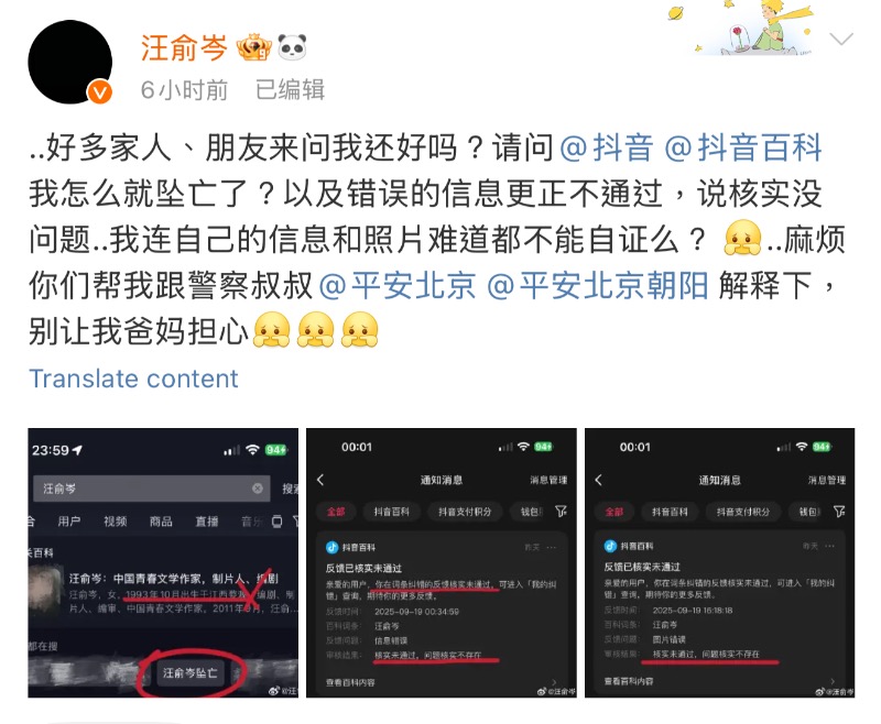 沒想到最新卻發展成,出現了汪俞岑「墜亡」的相關詞條,引起她身邊親友擔憂!最讓人震驚的是,身為當事人的她,卻沒有權利修改錯誤的信息👇