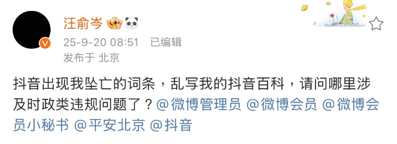 隨後汪俞岑再發文,表示出現了自己墜亡的詞條,百科資料還被亂寫,結果貼文不能被公開的原因,居然是「涉及政類違規」信息???