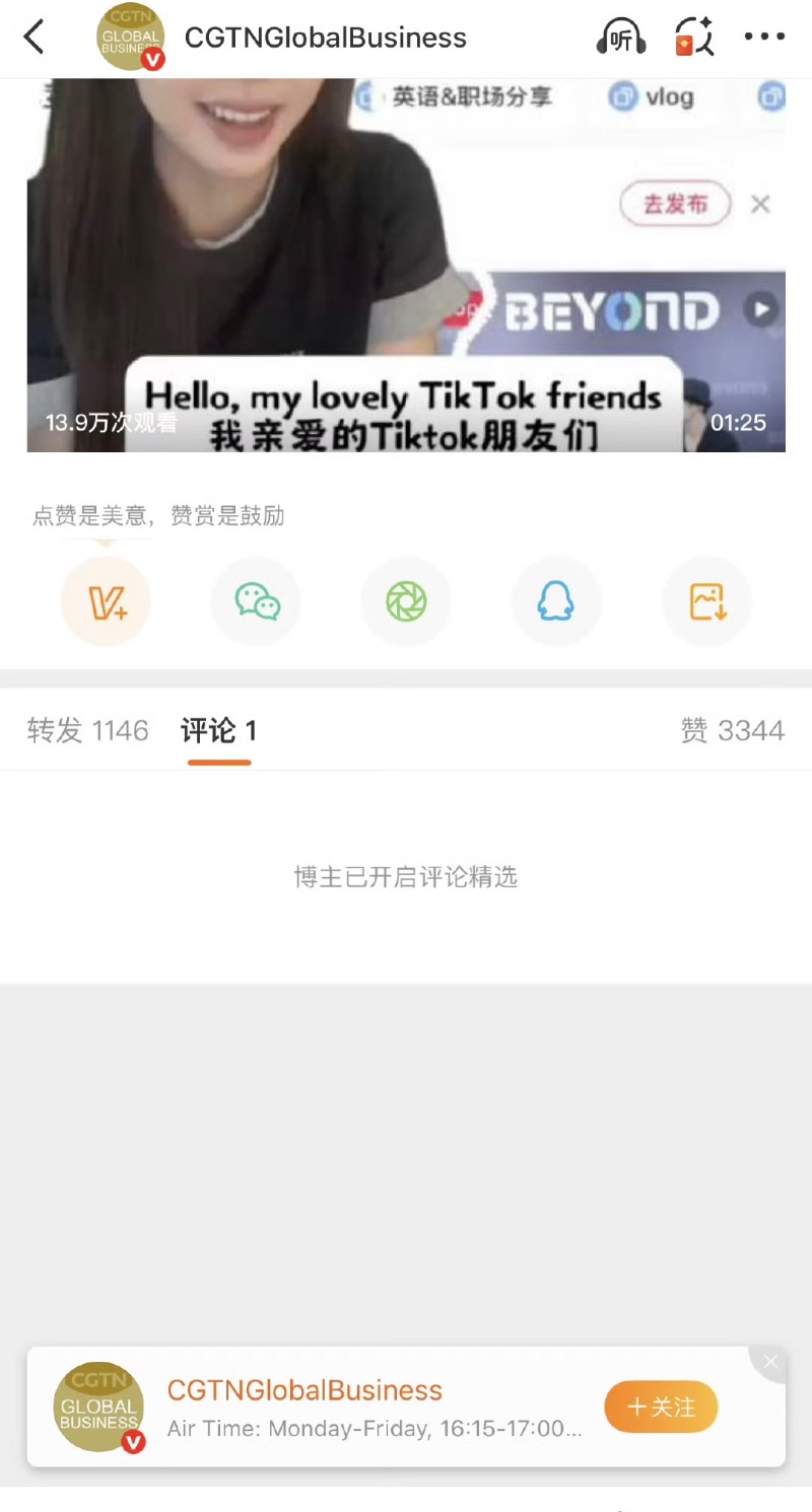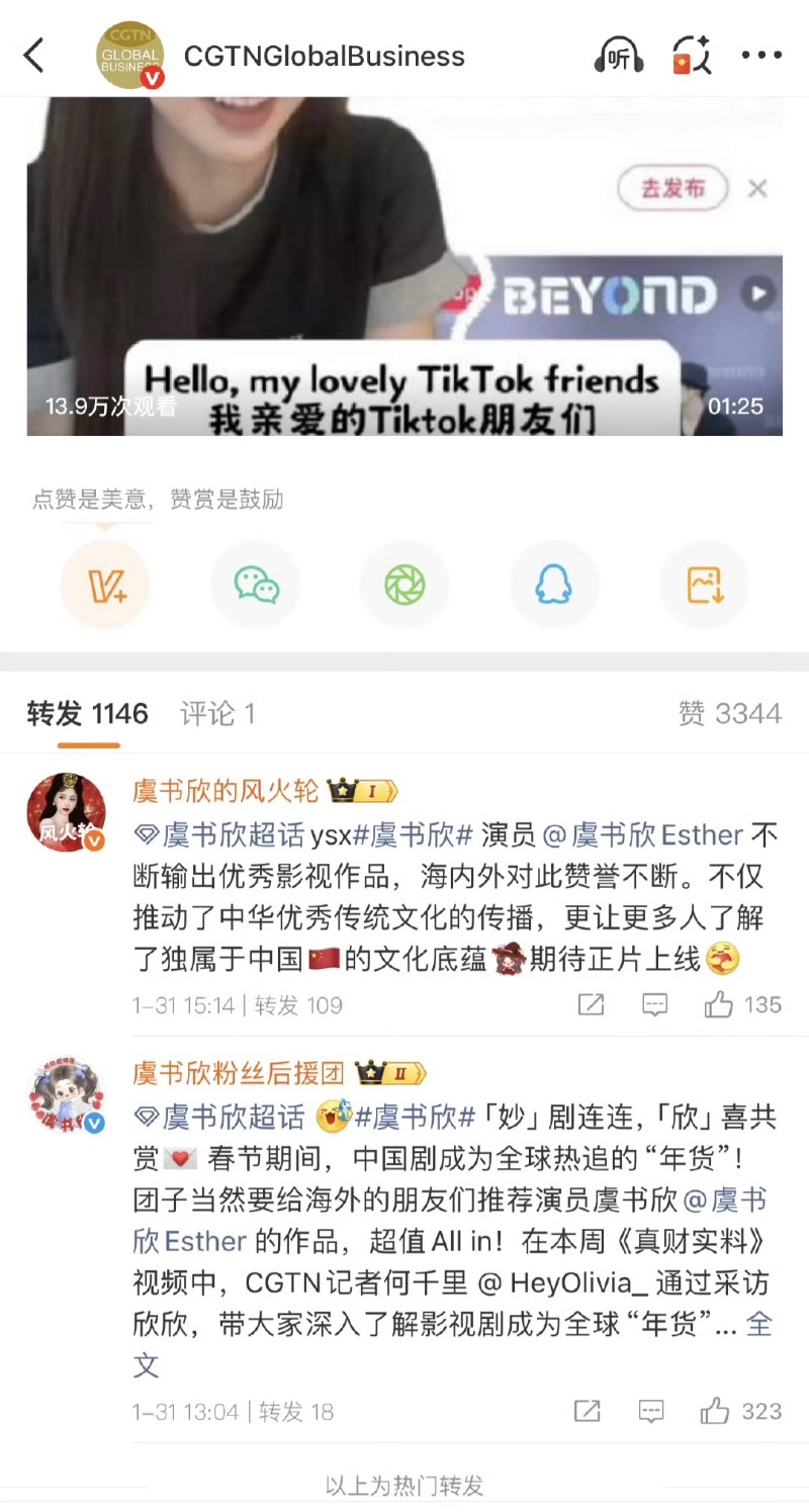 CGTN也將評論區開啟了精選,原本評論區熱評,都是虞書欣粉絲的留言👇