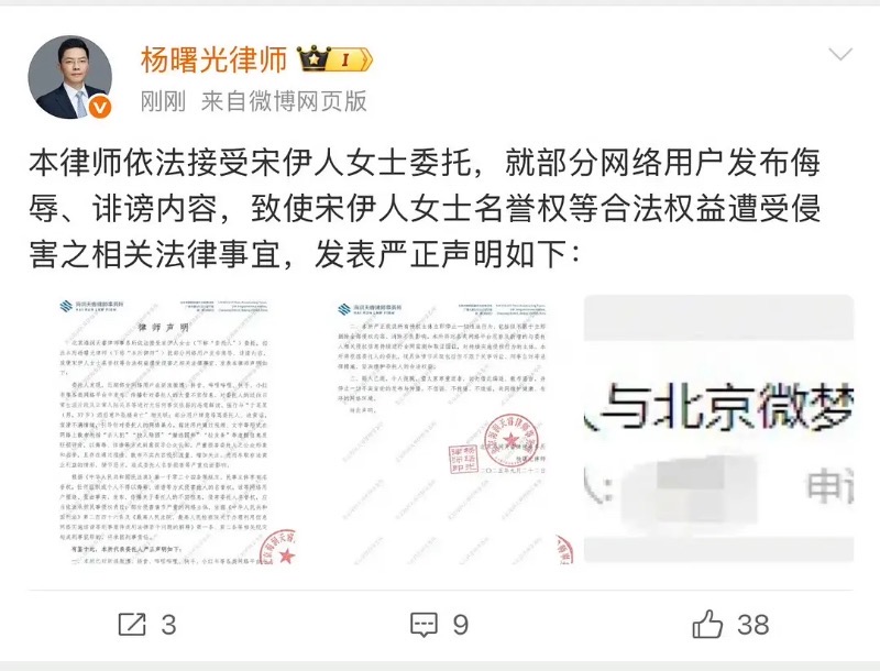 隨著警方在21號晚間公開了通報,一直保持沈默的宋伊人,在22號晚間通過律師,正式維權!