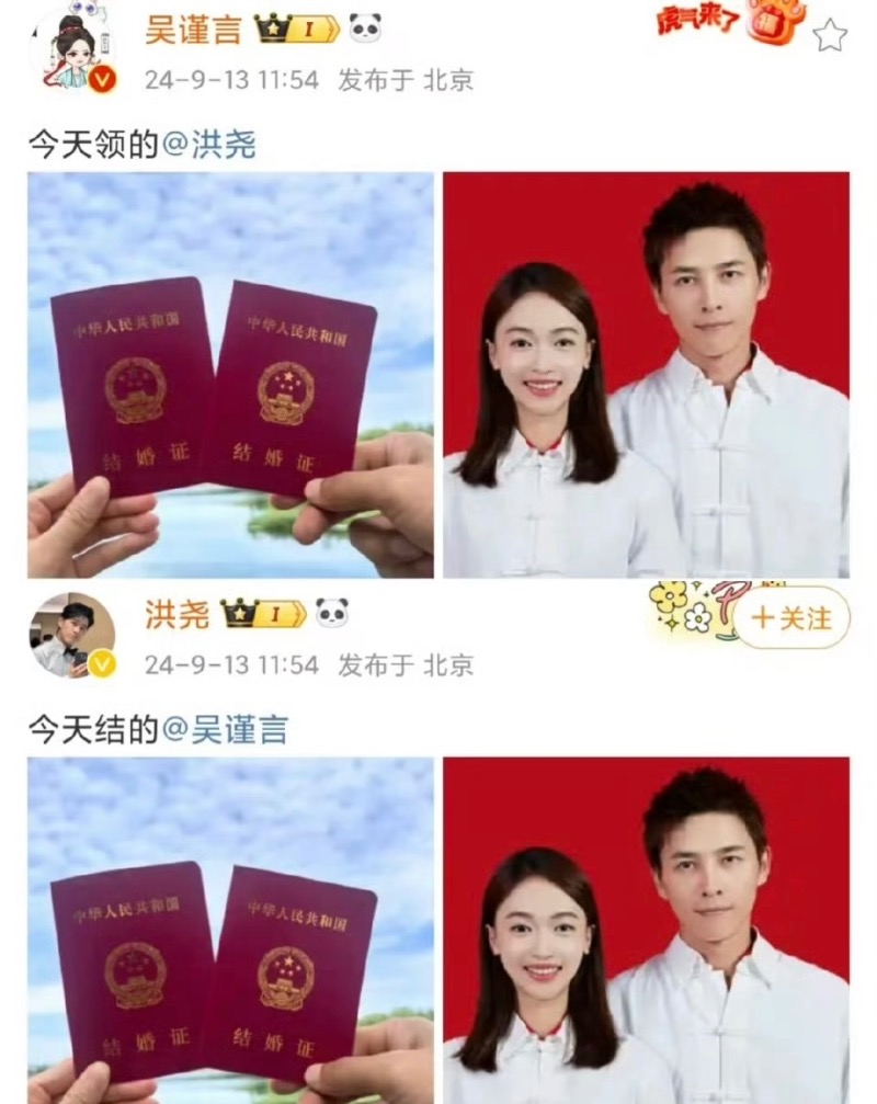 洪堯和吳謹言在24年9月13日,無預警曬出結婚證,直接炸了熱搜!