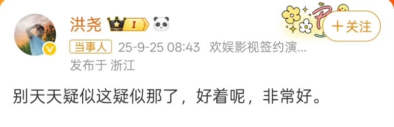 就開始有網友質疑,是不是兩人婚姻狀況出了問題?隨著熱議,洪堯發文回應,表示:「別天天疑似這疑似那了,好著呢,非常好。」直接闢謠!