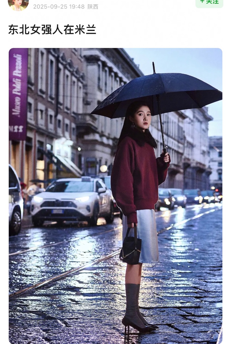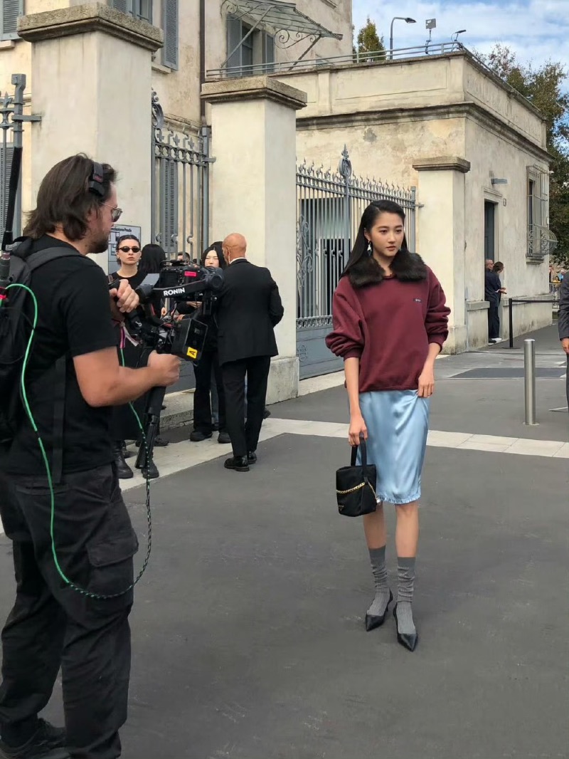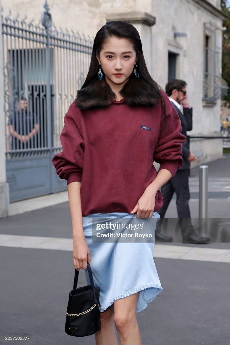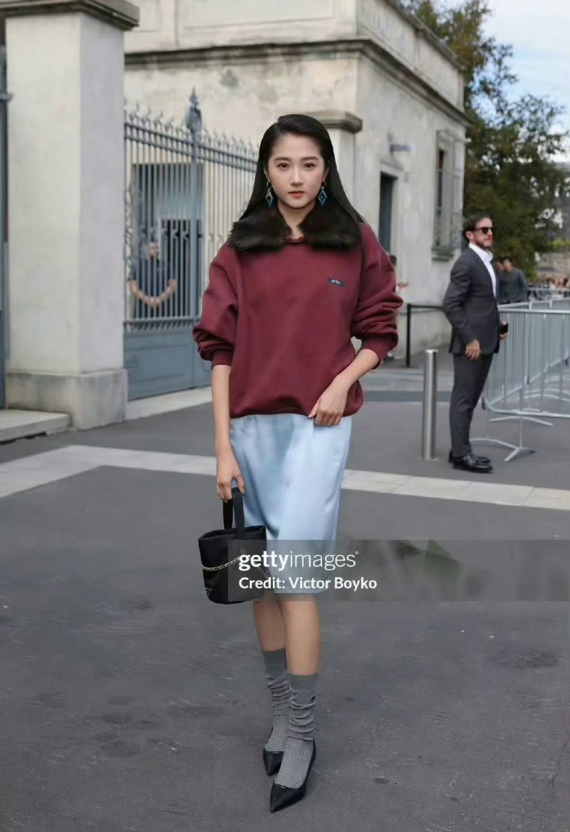 結果沒想到,到了這次米蘭之行的重頭戲:看秀造型時,卻引起了熱議!先來看看工作室的出圖,暗紅色上衣搭配淺藍色過膝裙,還梳了個斜分髮型👇