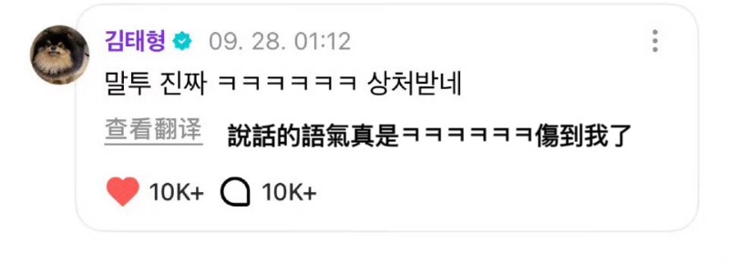 結果被金泰亨翻牌回應,表示「傷到我了」