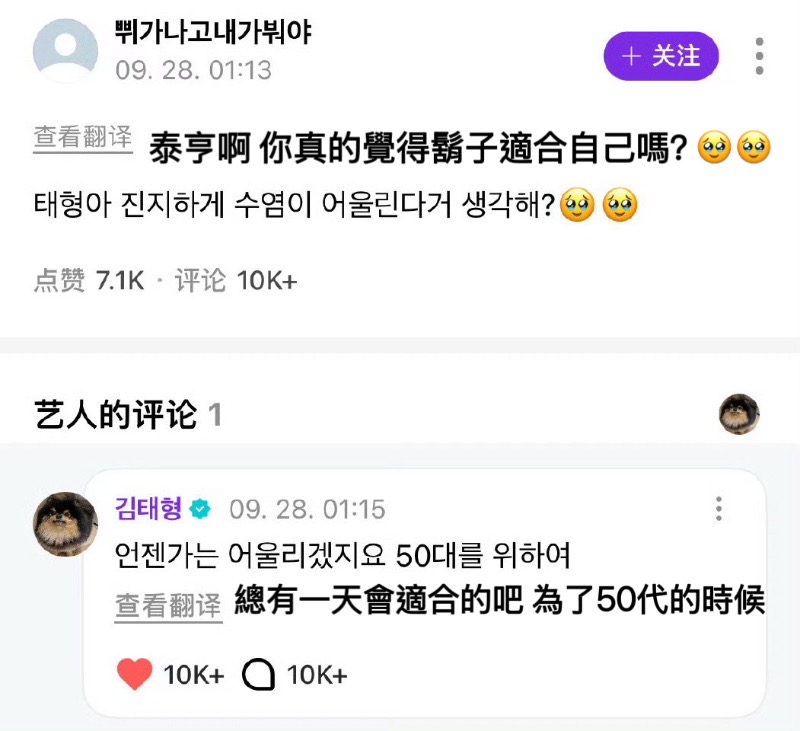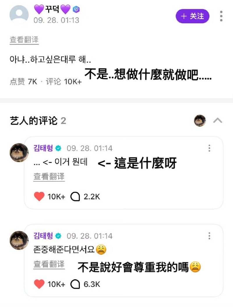 另一個粉絲留言也被翻牌,因為用了省略號,被金泰亨反問「⋯」是什麼意思?並問粉絲不是說了會尊重他嗎?