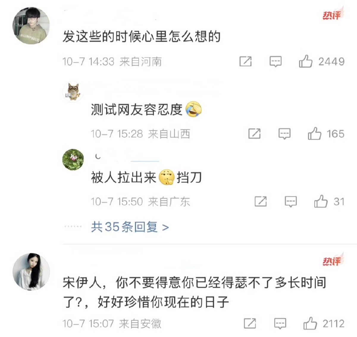 宋伊人更新微博被指「測試網友容忍度!」這些熱評全被刪! 星聞 By 歐巴是我的 On Oct 7, 2025 Share 是達,除了范世錡,另一個被指是于朦朧墜樓案「涉案人」之一的,就是被指是「中間人」的宋伊人,同樣遭受不少網暴! 宋伊人和范世錡一樣,曾發長文自我辯解,針對網傳指控一一回應!但和范世錡一樣,網友們似乎不買賬! 而在7號這天,宋伊人久違的更新了微博,和之前的風格一樣,分享了自己的日常! 只不過評論區很快就被網友的負面留言佔領,認為她在測試網友容忍度,熱評包括👇 目前,這些留言都已經被刪除,僅留下粉絲留言👇 圖來源:部分照片取自網路,若侵權請告知 Share
