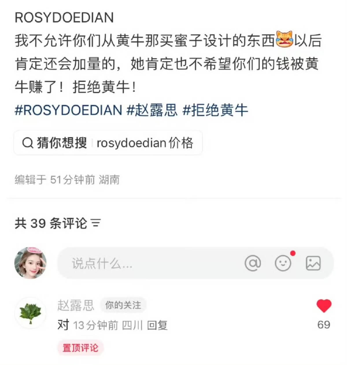 不過也有網友認為,這些商品的定價都超過分,有割韭菜之嫌疑!但市場需求真的很大,上線即秒空,引發黃牛高價炒賣,趙露思還特別在粉絲貼文下留言,呼籲抵制黃牛!