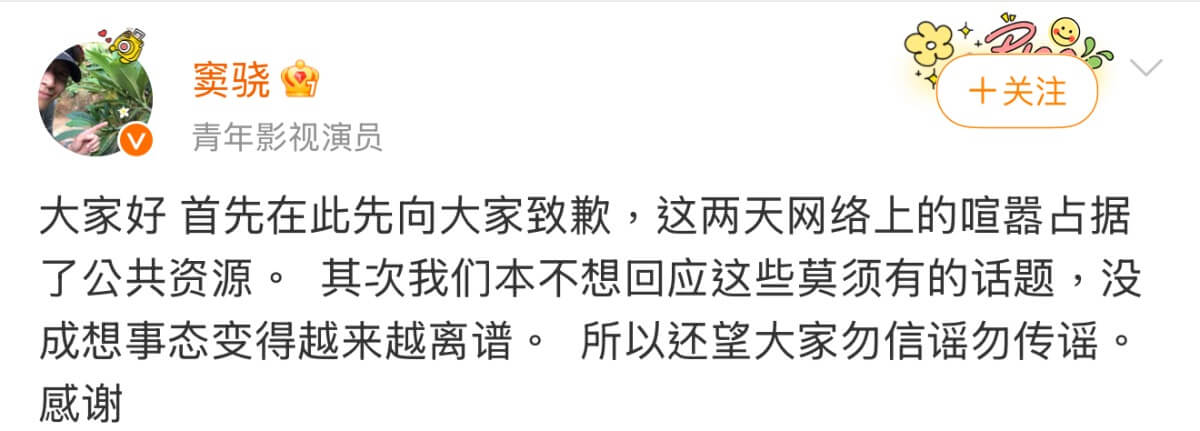 隨著傳聞越傳越誇張,竇驍和何超蓮雙雙在23號晚間發文回應!先是竇驍發文為浪費公共資源道歉,表示:「我們本不想回應這些莫須有的話題,沒成想事態變得越來越離譜」,希望大家勿信謠勿傳謠。