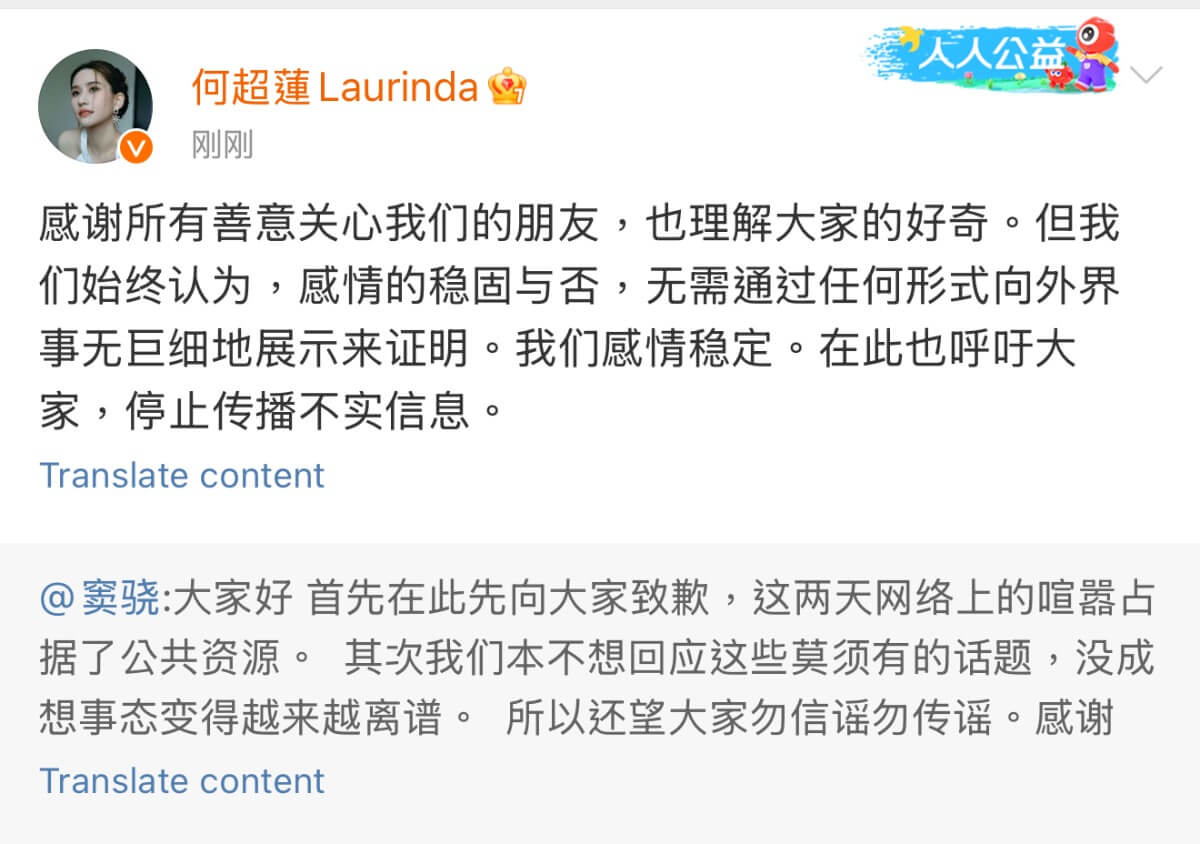 隨後何超蓮轉發表示感情的穩固與否,無需通過任何形式,向外界事無鉅細地展示來證明,最後也強調:「我們感情穩定。」