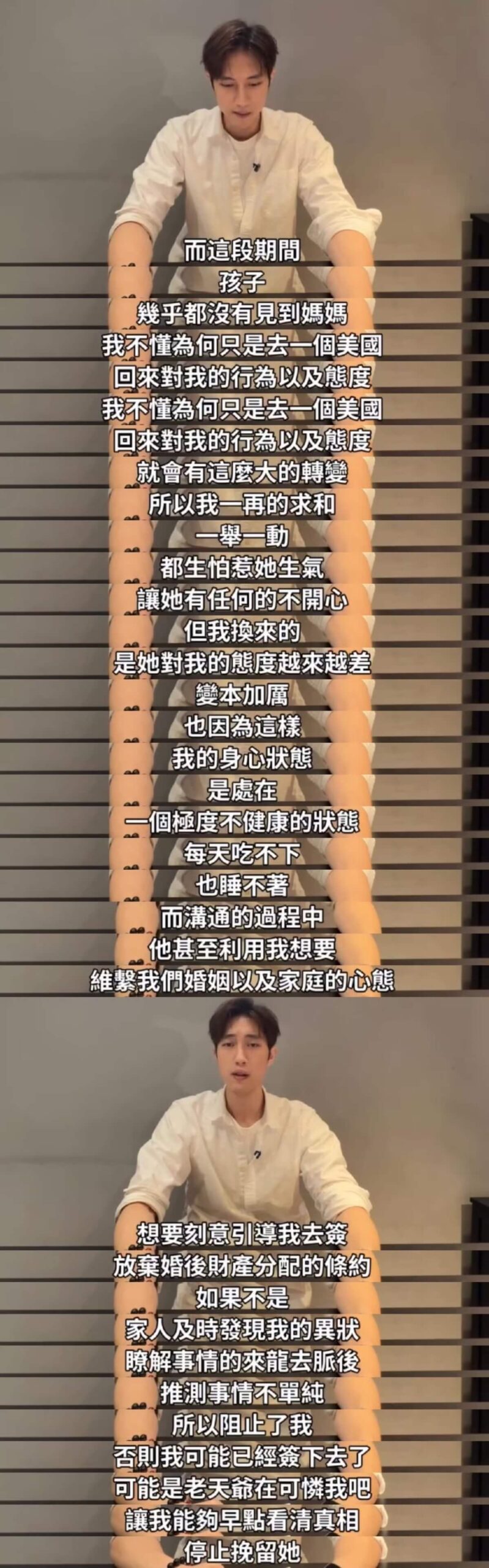 范姜彥豐說自己一直在求和,但是換來粿粿態度上的變本加厲,並被引導着簽下放棄婚後財產分配的條約,幸好被家人阻止了。