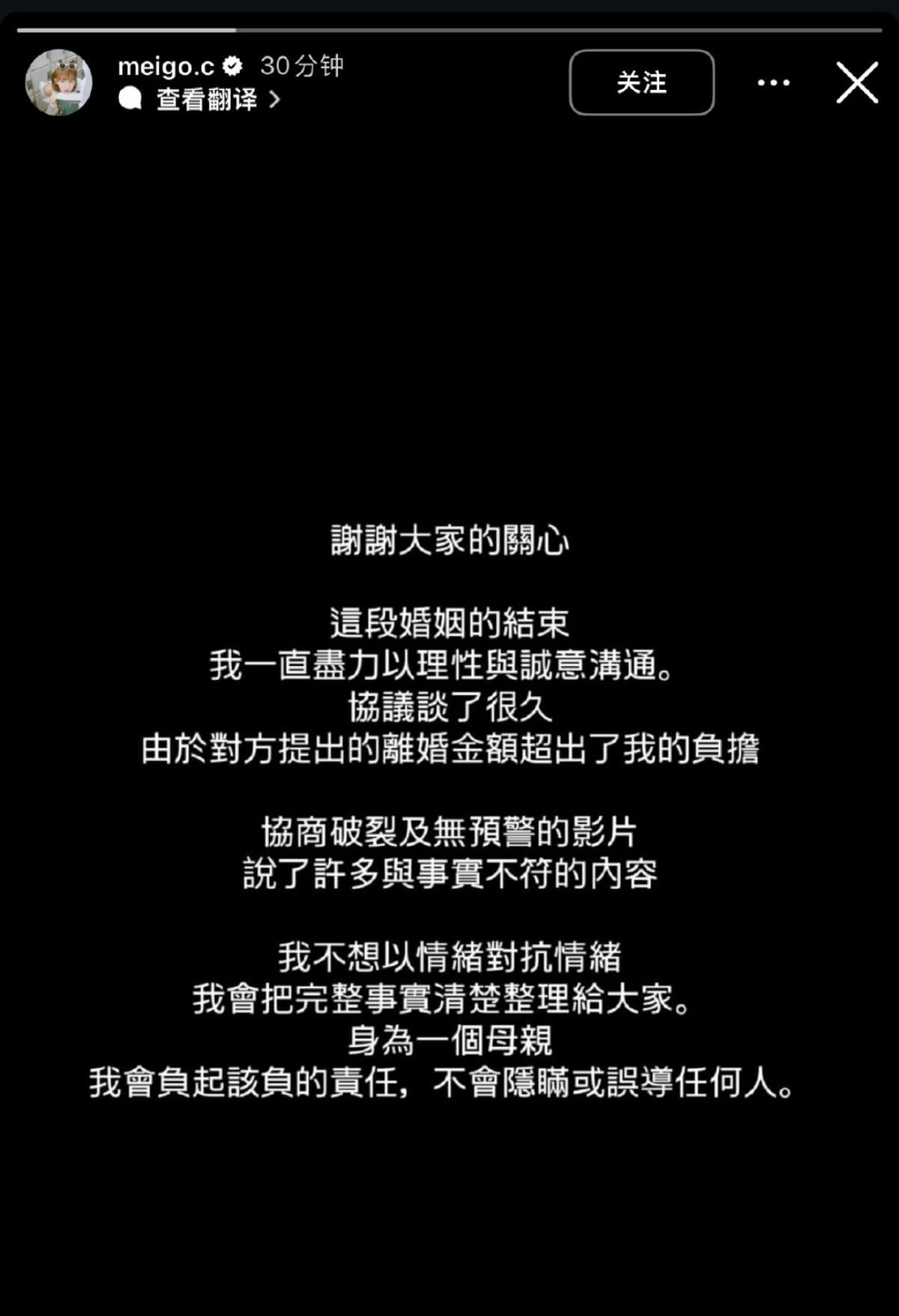 隨著控訴,妻子粿粿發文回應,表示范姜彥豐提出的離婚金額超出了自己的負擔,並稱會把完整事情清楚整理給大家。負起該負的責任,不會隱瞞或誤導任何人。