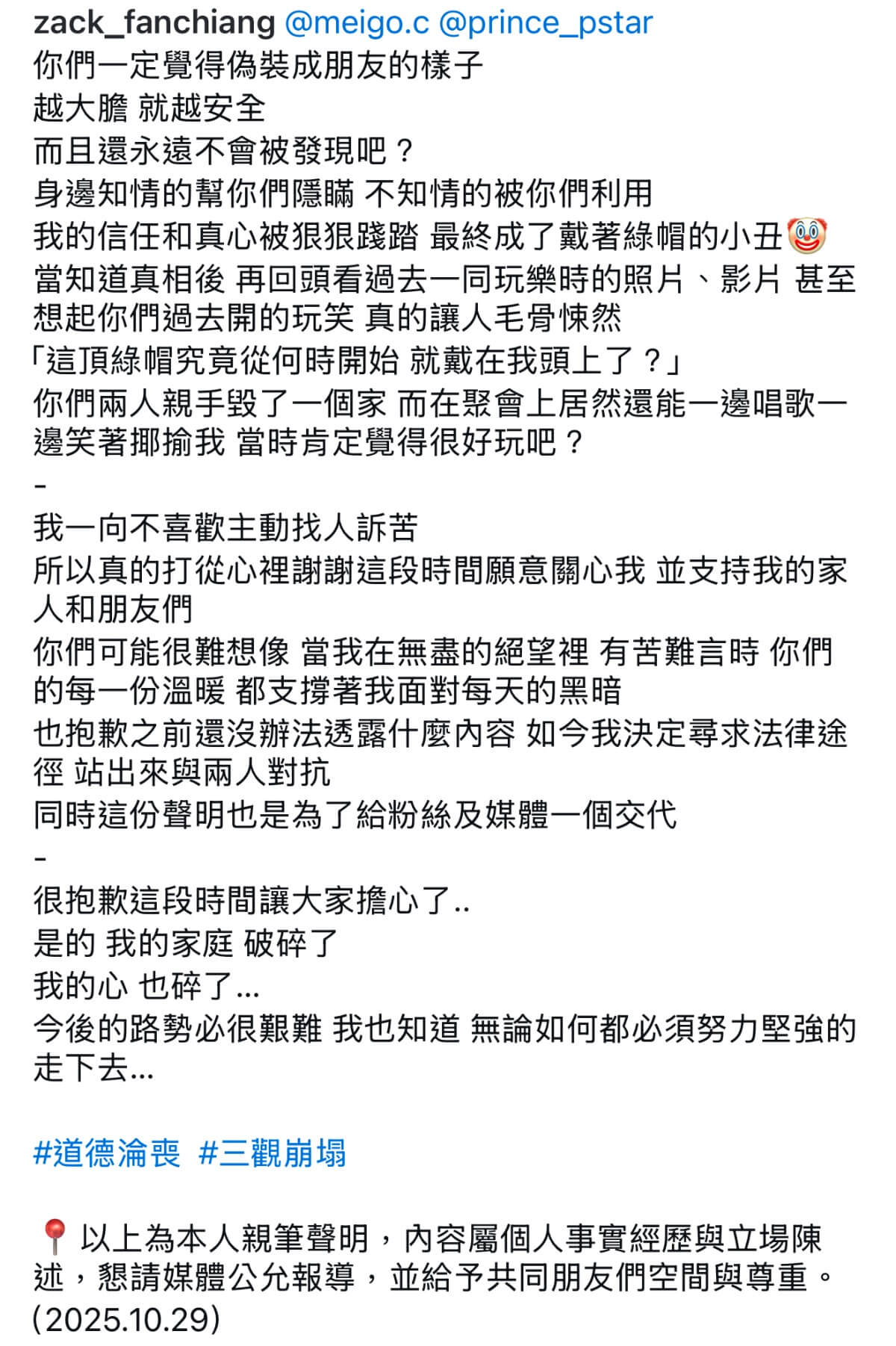 是噠,台灣明星夫妻檔范姜彥豐、粿粿因為婚變引起爭議,男方在29號這天突然拋出震撼彈,實名指控妻子婚內出軌王子(邱勝翊),表示自己看到兩人出軌鐵證!