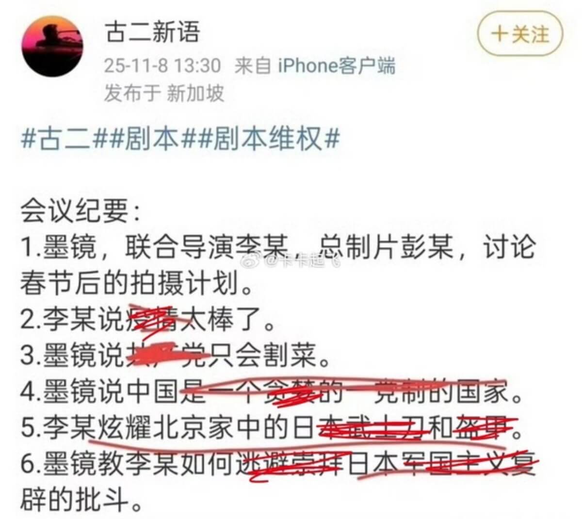 但最炸裂的,還是第二篇爆料貼文,當中提到了有關墨鏡(王家衛)、《繁花》聯合導演李S(李爽),以及總製片彭某之間的聊天,當中提到了大量政治課題👇