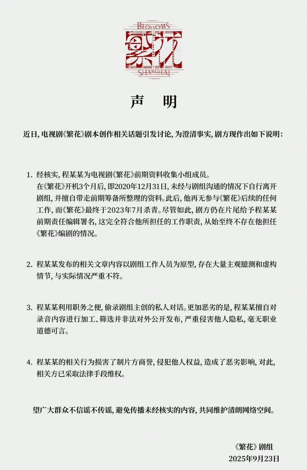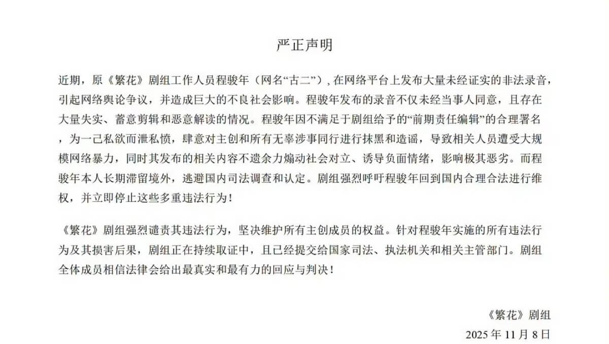 《繁花》劇組強烈譴責其違法行爲,堅決維護所有主創成員的權益。針對古二(程駿年)實施的所有違法行爲及其損害後果,劇組正在持續取證中,且已經提交給國家司法、執法機關和相關主管部門。