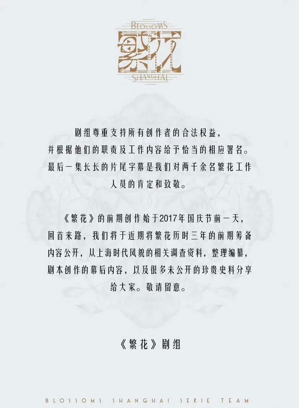 《繁花》劇組強烈譴責其違法行爲,堅決維護所有主創成員的權益。針對古二(程駿年)實施的所有違法行爲及其損害後果,劇組正在持續取證中,且已經提交給國家司法、執法機關和相關主管部門。