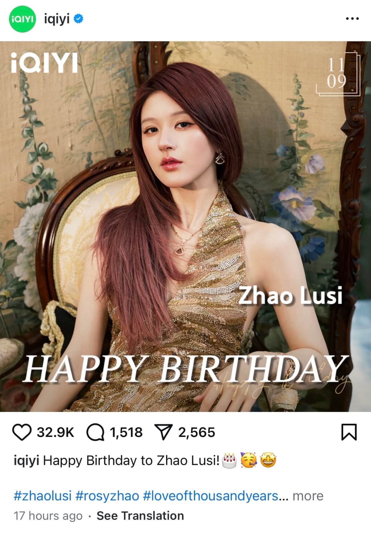 優酷、騰訊都表態了,怎麼獨缺愛奇藝呢?沒關係,雖然現場沒準備到花籃,但在趙露思生日這天,愛奇藝在INS平台發了趙露思的生日祝福,才發了不足一天,點讚量就好多👇