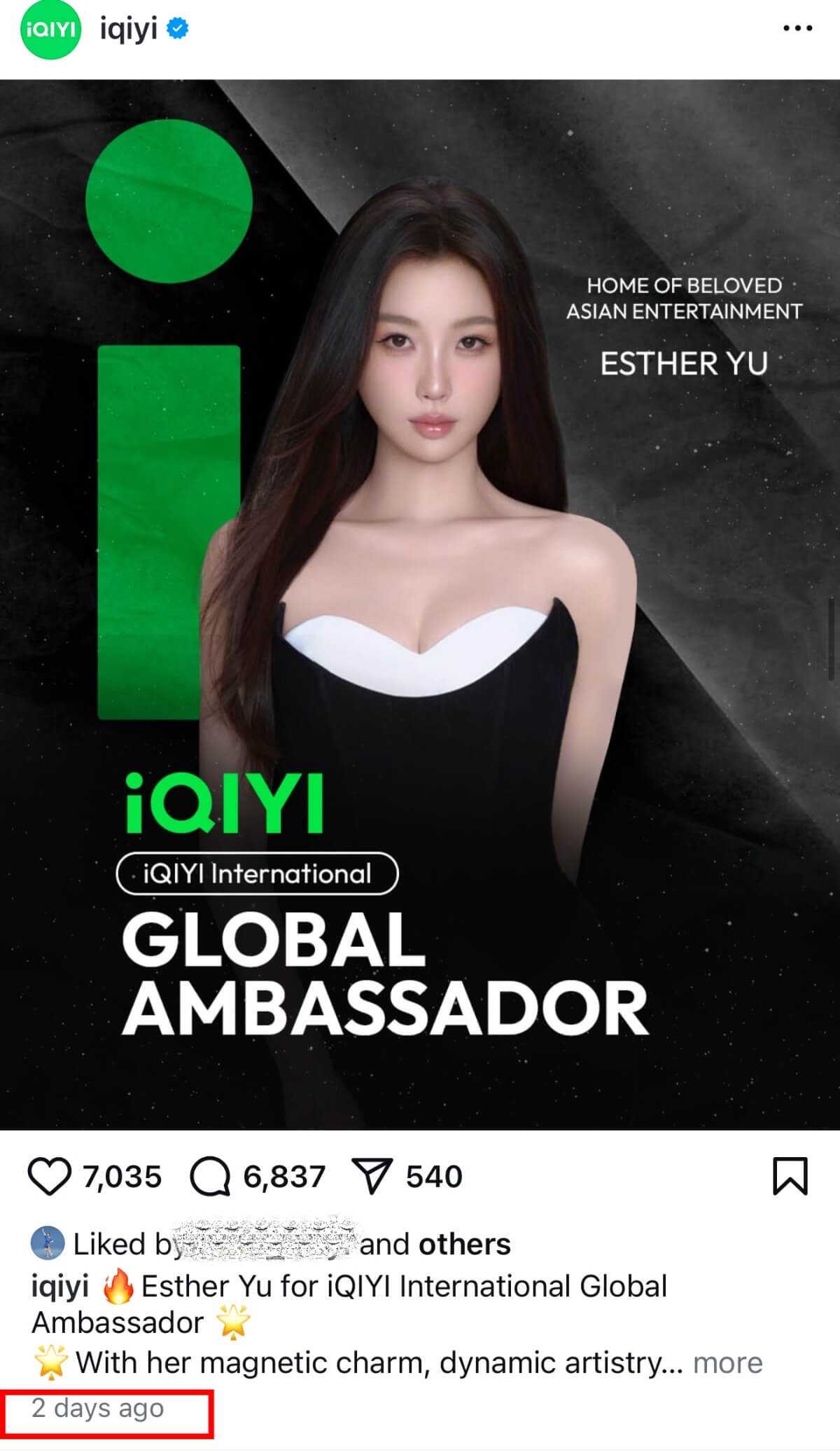 尷尬的是,愛奇藝兩天前剛官宣了虞書欣是全球代言人,但看看該貼文的點讚數量,真的遠比趙露思的生日帖文少了好幾倍👇