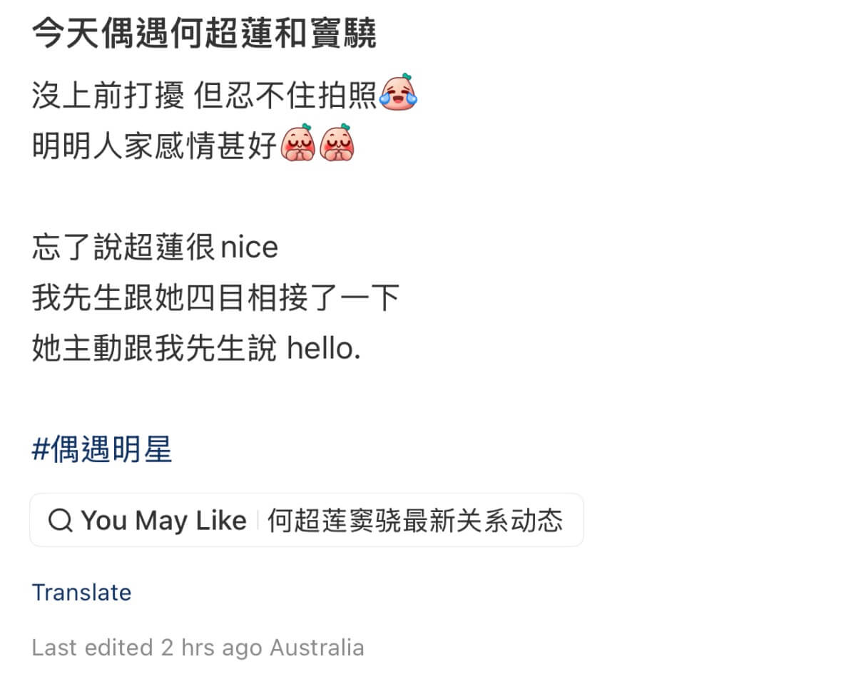 但有些網友依然不相信,認為兩人只是維持「契約婚姻」!沒想到,日前就有網友在澳大利亞偶遇兩人,表示兩人看起來感情很好,還特別稱讚了何超蓮,說她主動向網友先生打招呼👇