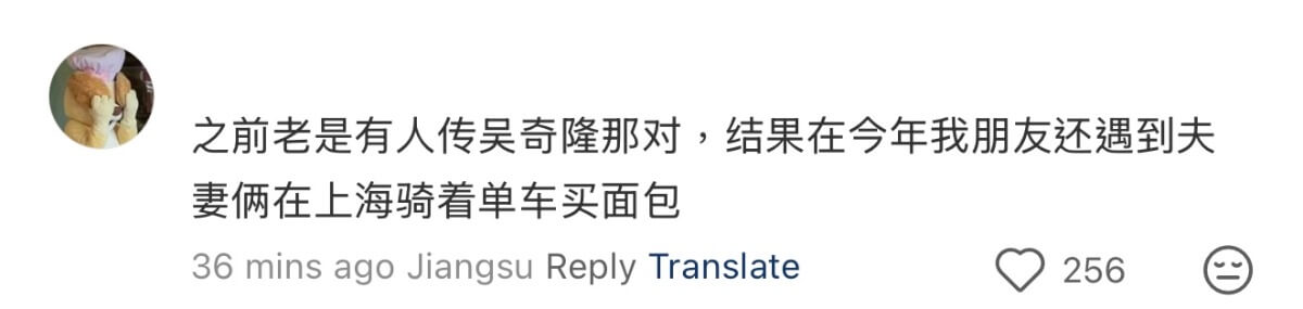 最經典的是,評論區還有網友爆料,表示一直被傳離婚的吳奇隆和劉詩詩,也曾被偶遇在上海騎單車買麵包👇