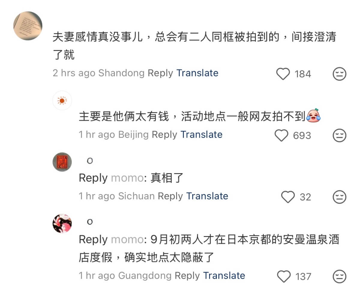 也有的認為兩人很難被拍到,主要還是因為太有錢,活動的地點一般網友拍不到,甚至有網友提及,9月初兩人去了日本京都度假👇