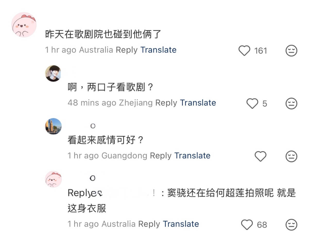 評論區還有網友表示,自己也在歌劇院遇到兩人,竇驍還幫何超蓮拍照👇