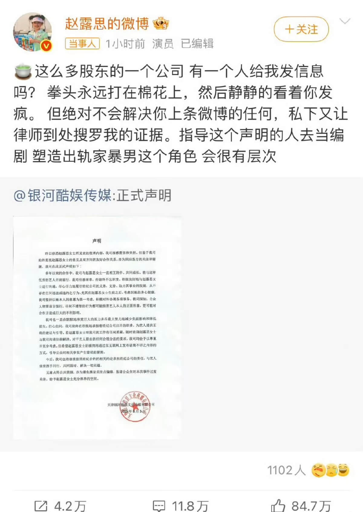 當初趙露思在微博公開喊話時,如果好好處理,應該也不會走到現在這一步,不曉得銀河酷娛有沒有後悔,當時沒有回應趙露思啊?