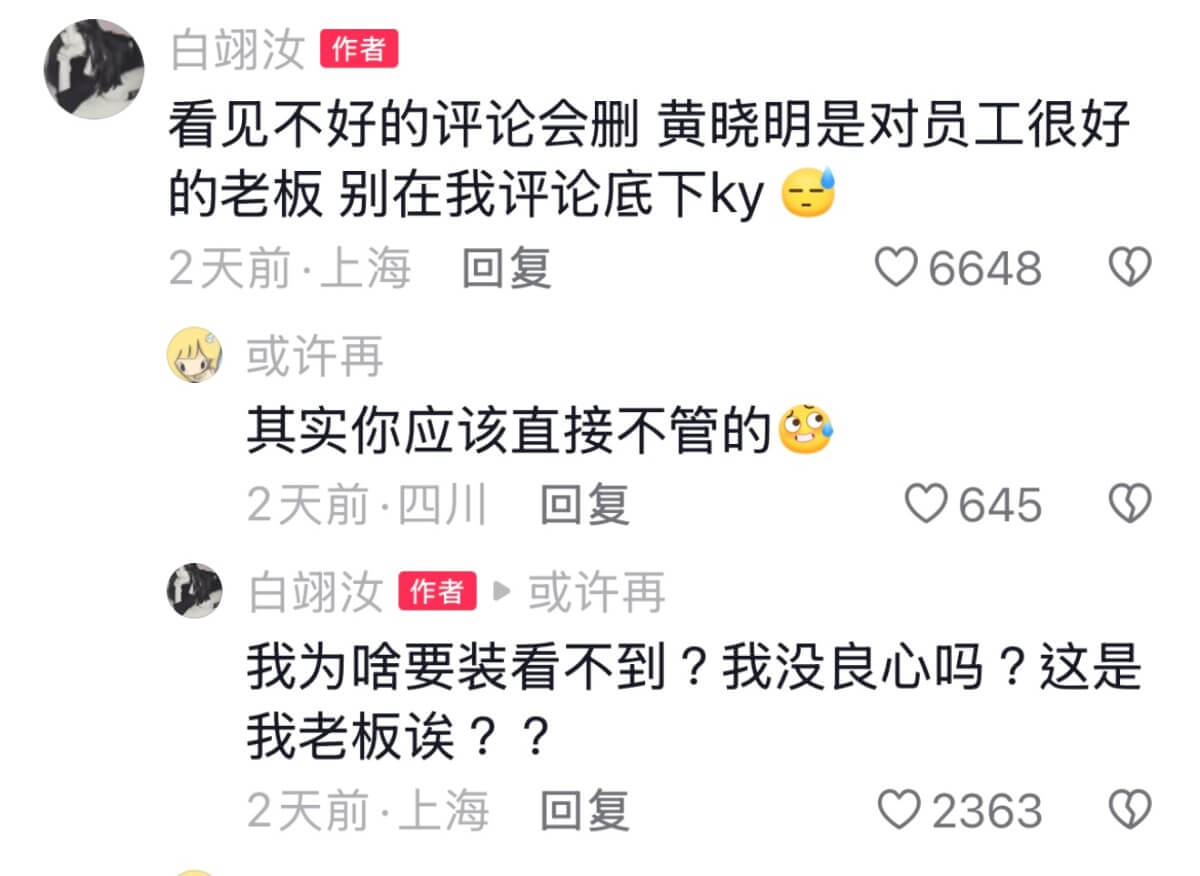 有不少網友在評論區造謠,結果她不但直接刪除評論,還表示黃曉明是對員工很好的員工!有網友認為她不應該回應,反被她回懟:「我為啥要裝看不到?我沒良心嗎?這是我老闆誒??」