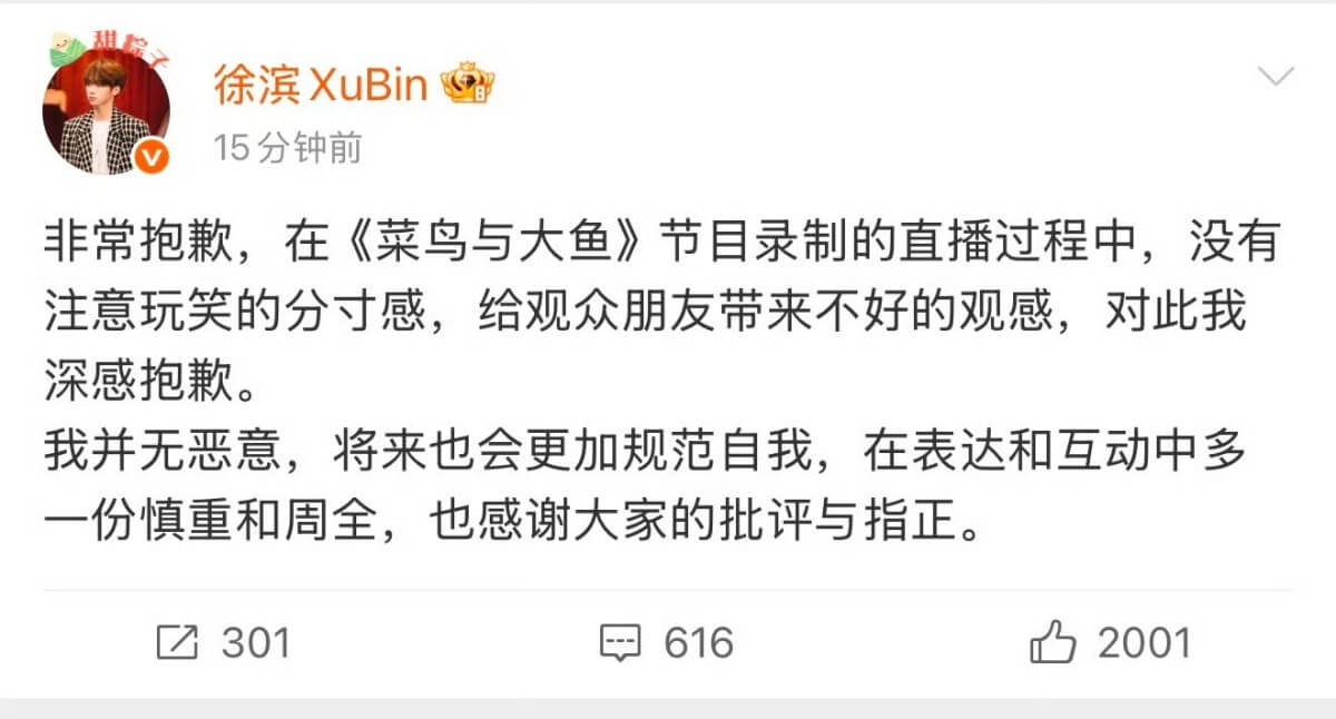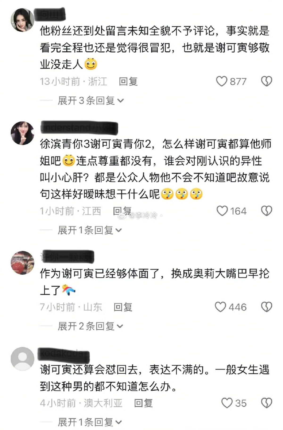 這段直播曝光之後,網友認為徐濱言語冒犯,屬職場騷擾,但徐濱粉絲則辯稱是「諧音梗破冰」,隨著熱議,徐濱發文道歉,表示「玩笑分寸不當」,但全文並無向謝可寅道歉。