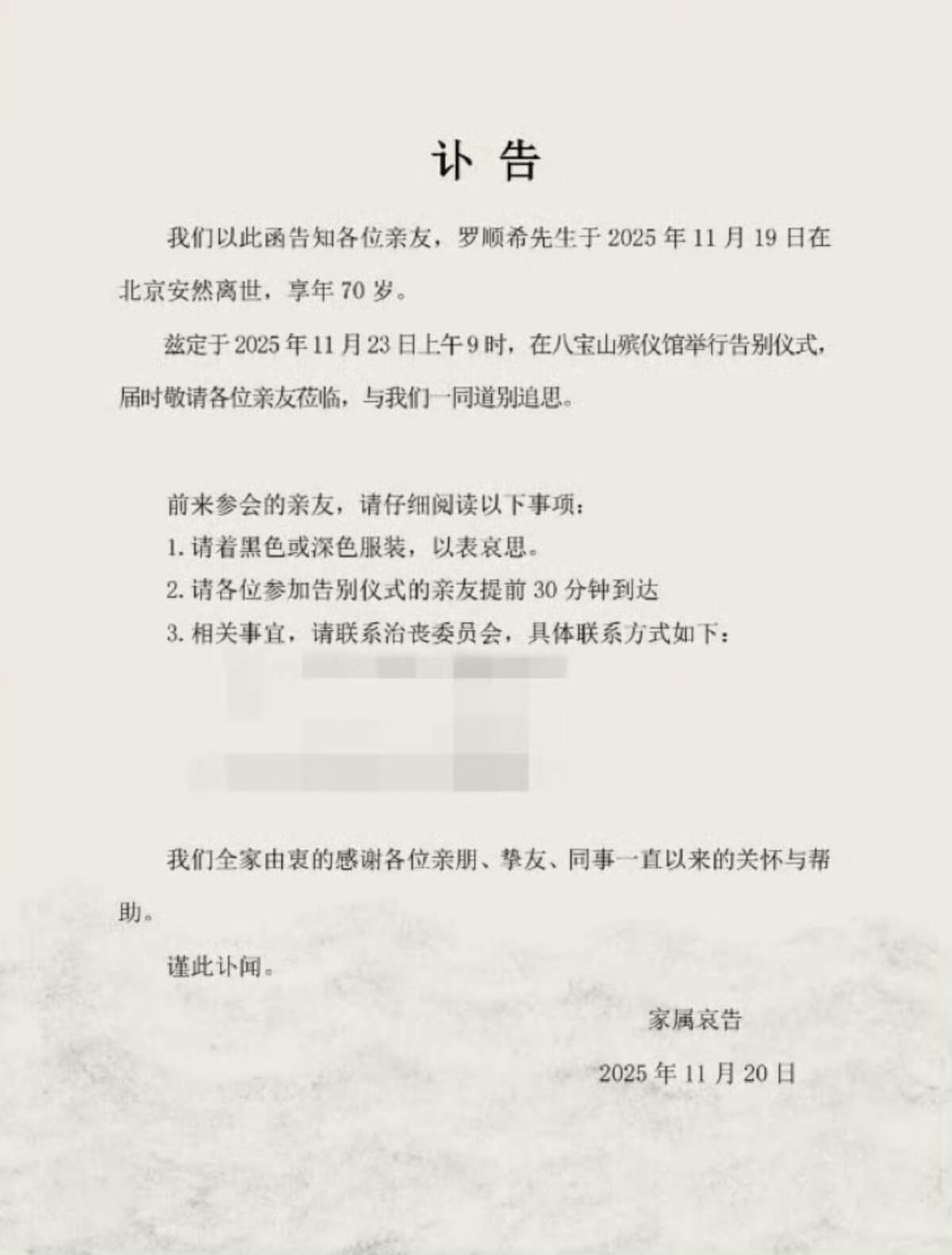 正當眾人質疑為什麼兩人居然不闢謠的時候,羅晉經紀人在朋友圈發佈訃告,表示羅晉的父親羅順希先生於11月19日在北京安然離世,享年70歲。目前羅晉本人及家人正處於悲痛之中,全心處理各項事務。