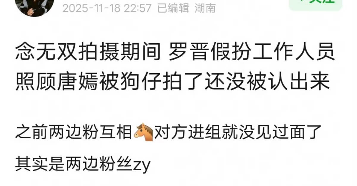 但也有網友爆料,表示兩人感情十分好,在2023年唐嫣受傷時,羅晉還假扮工作人員陪伴👇