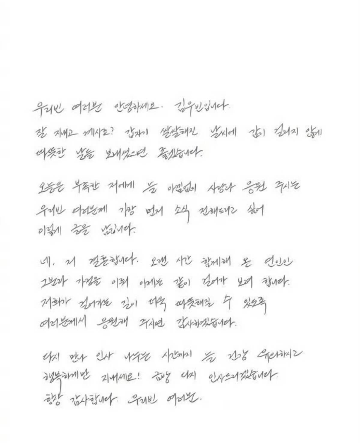 金宇彬發表了手寫信,公開即將和申敏兒結婚的喜訊,他表示「對,我要結婚了,和長時間以來一起的那位戀人,準備組成家庭一直走下去了。」