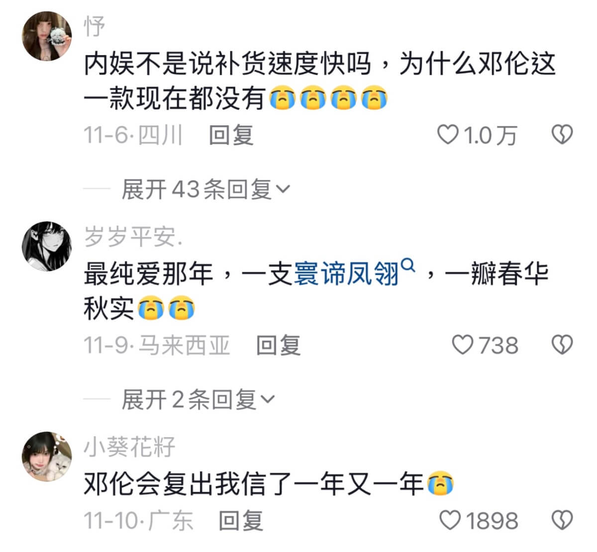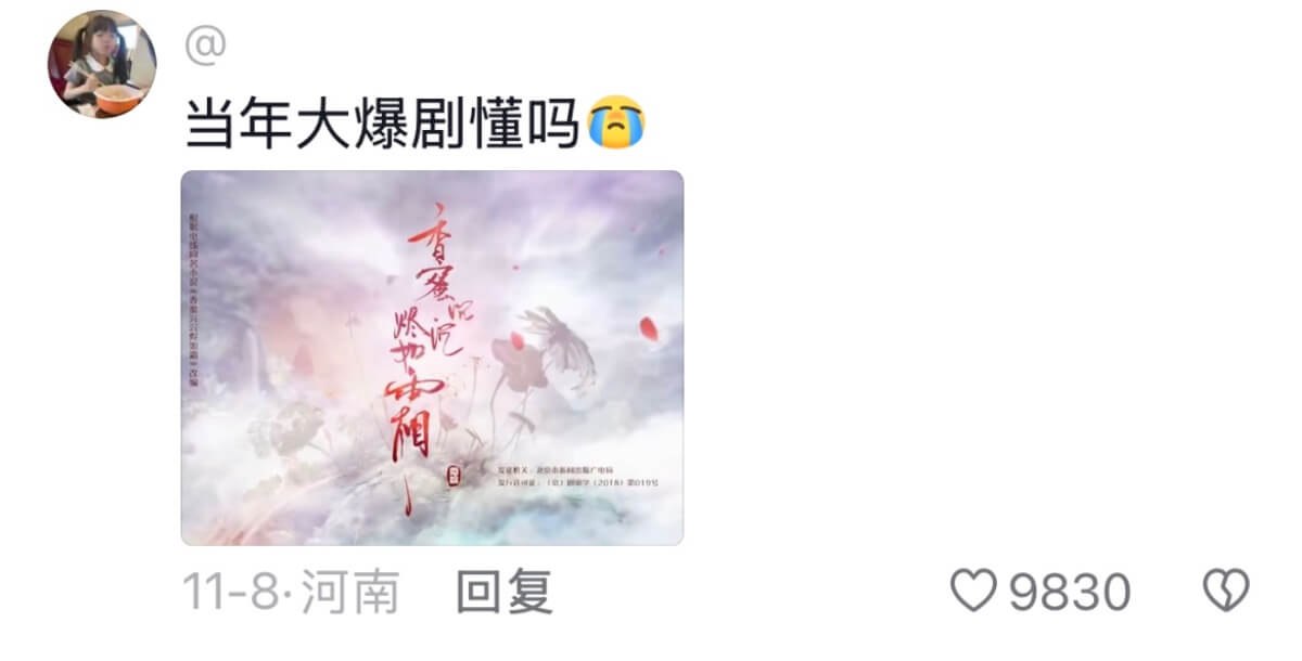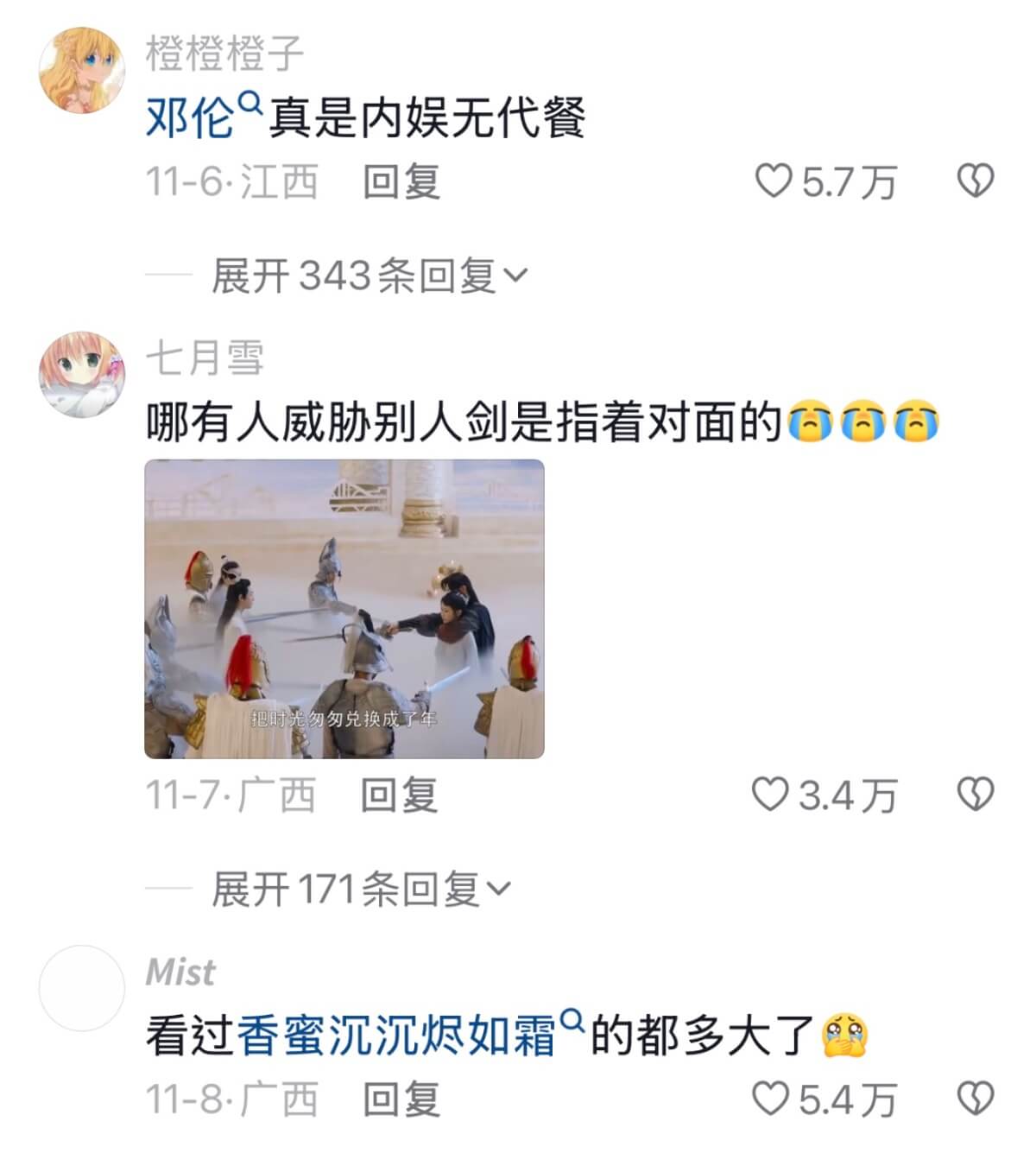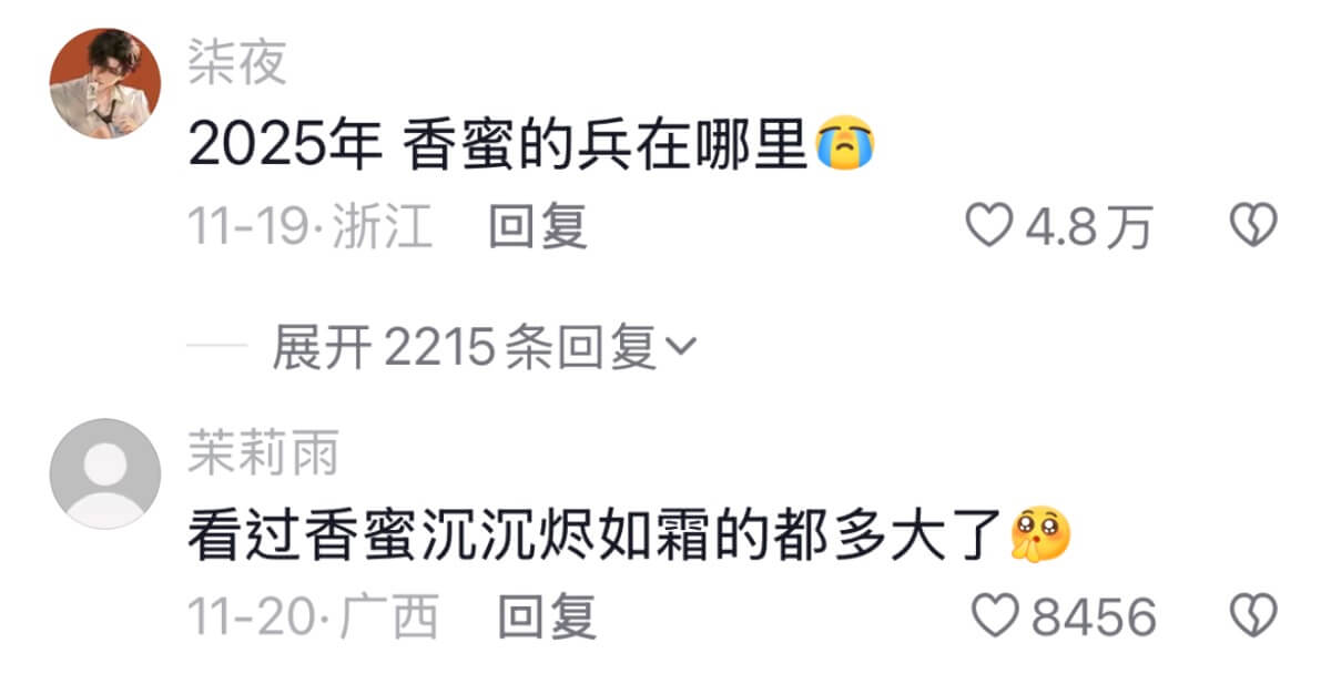 來看網友們的評論,有在回憶電視劇的,有在號召香蜜女孩的,當然少不了想念一下因透漏稅而被封殺的鄧倫👇