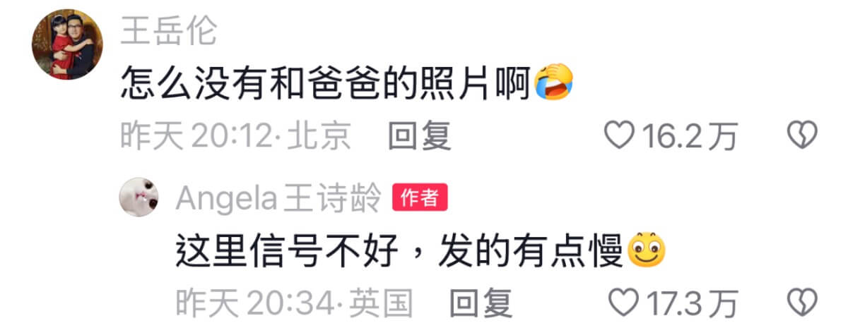 沒想到爸爸王岳倫也留言,表示為什麼沒有和爸爸的合影呢?只見王詩齡十分高情商回應,表示網速太慢,還沒發👇