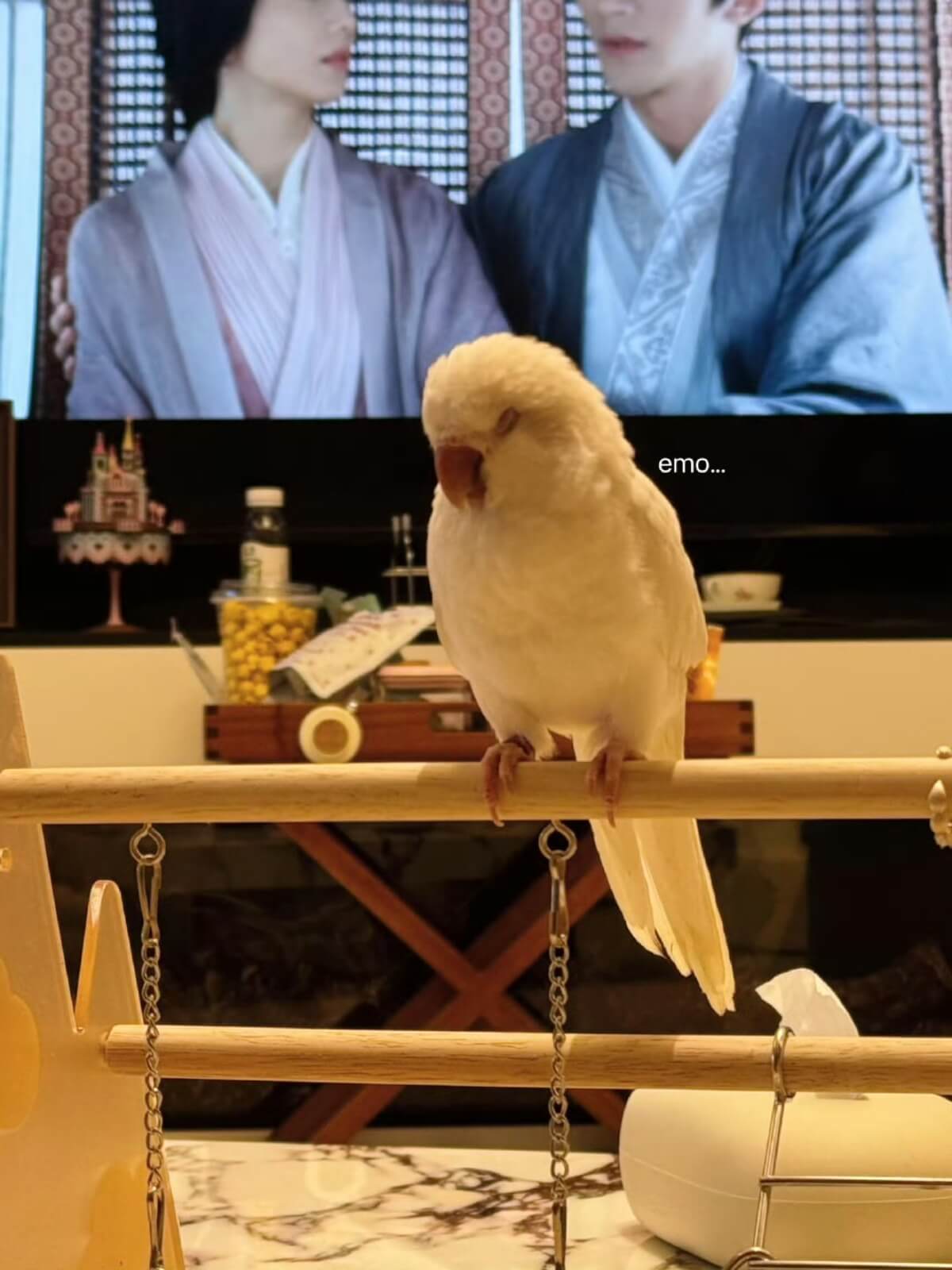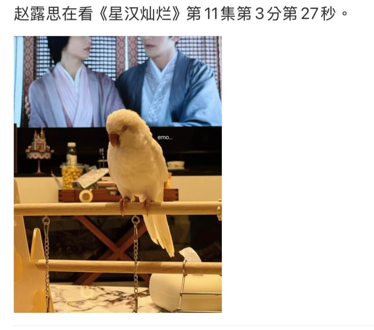 而網友也發現,趙露思編輯了自己的原貼文,這次追加了一張自家寵物鸚鵡,在電視機前的照片👇
