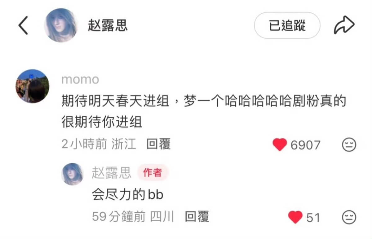 隨後有網友分享,趙露思回應了自己有關「春天進組」的許願,表示自己「會盡力的bb(寶寶)」不過目前這則評論已經被刪除👇