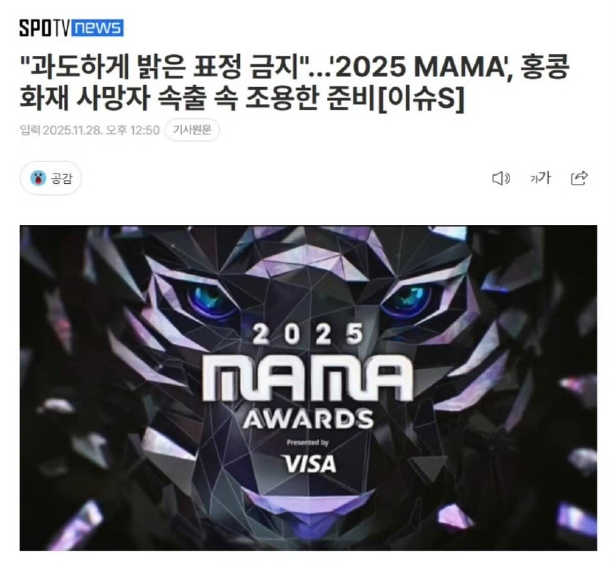而即將於28、29號在香港舉辦的2025年「MAMA頒獎禮」,仍決定如期舉行,並向藝人提出了多項注意事項,當中包括取消了紅毯環節及煙火特效,舞台燈光統一改為冷色調。