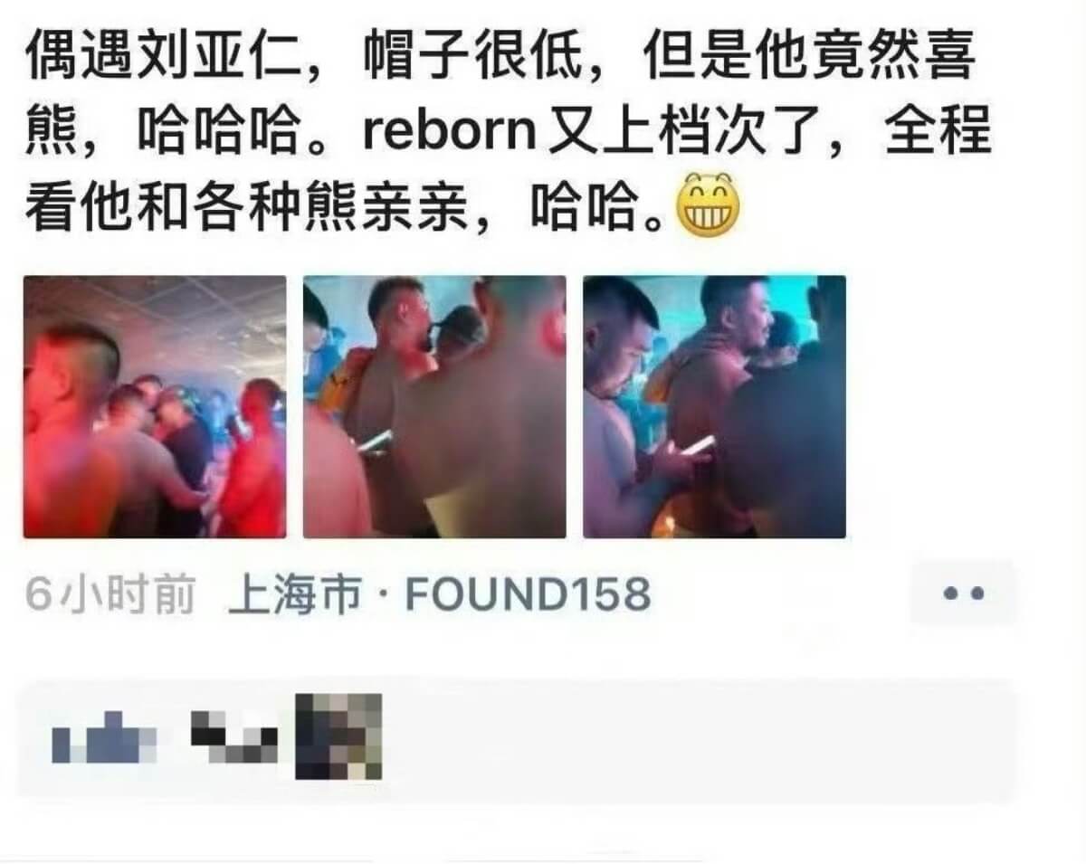 是噠,有網友公開了朋友圈截圖,表示自己在上海酒吧偶遇到劉亞仁,並提及目睹了他全程和各種「熊」親親👇