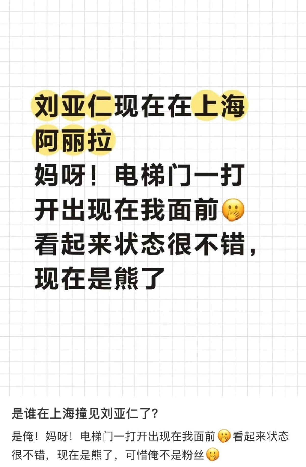 另外,還有網友表示在上海酒店偶遇劉亞仁,表示現在看起來就是「熊」,而且偶遇了兩次👇