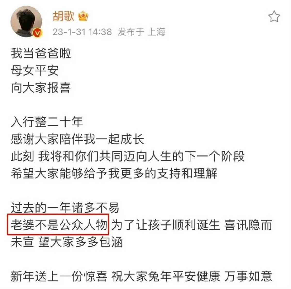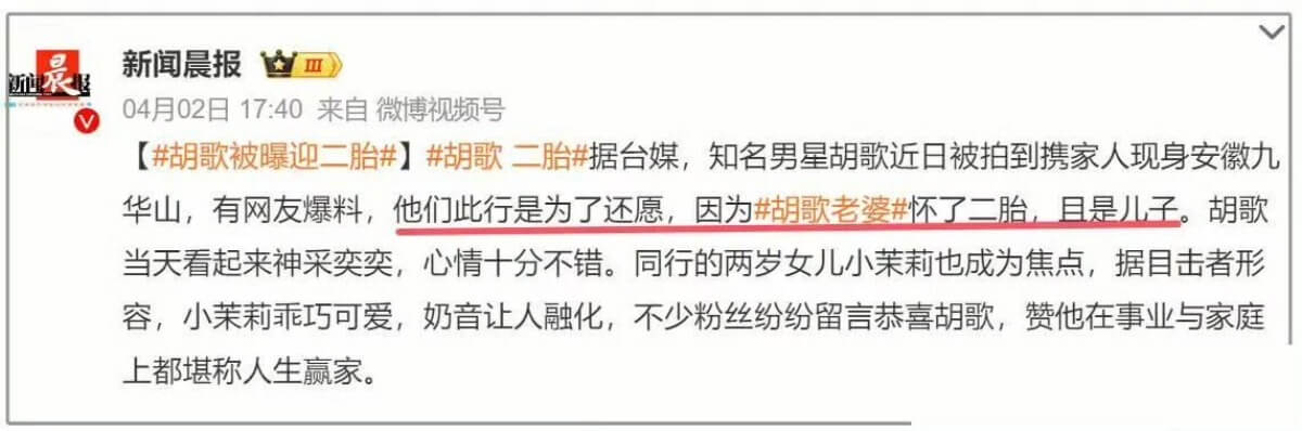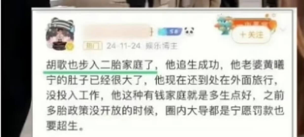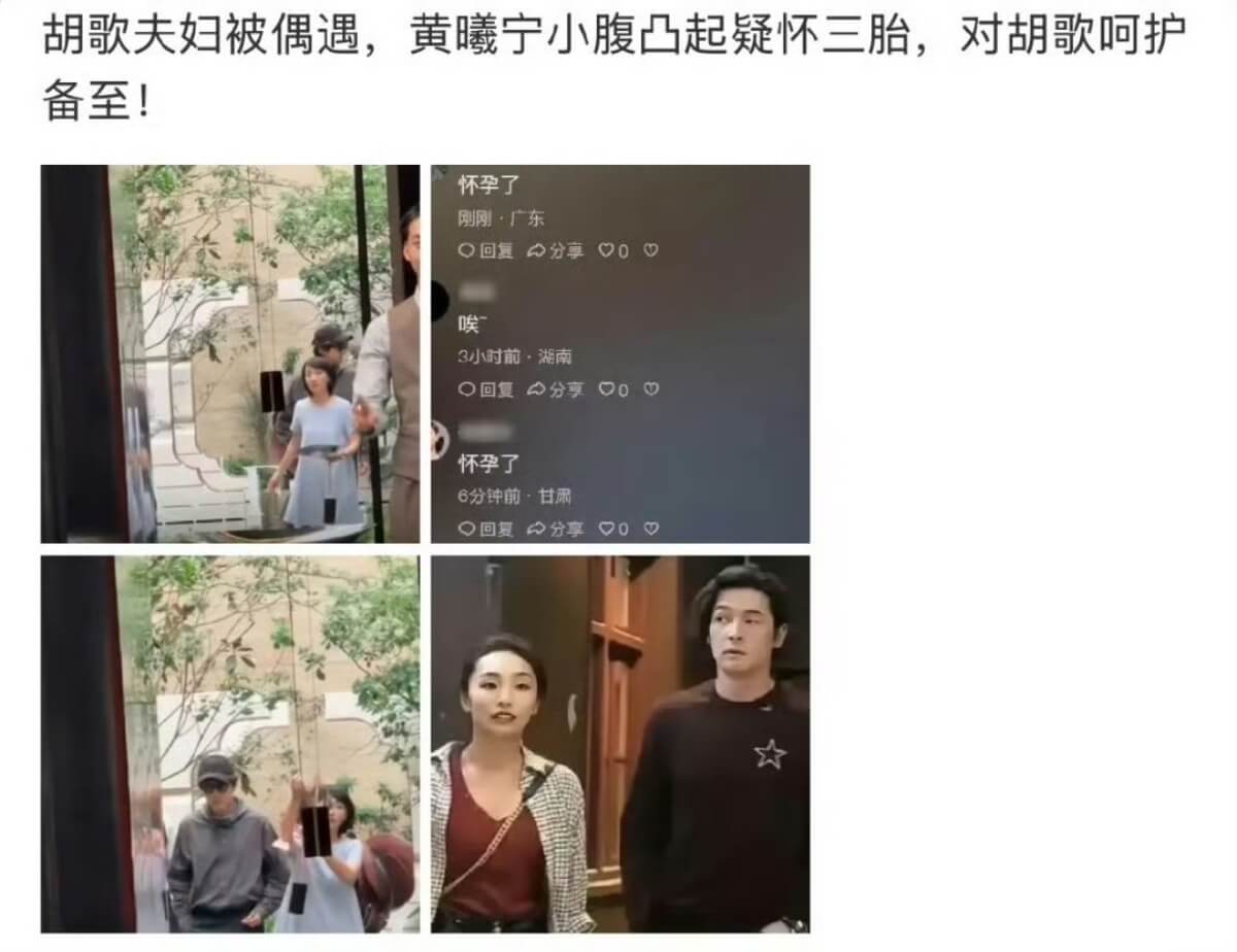 傳聞是真的!胡歌二胎是男的!網友偶遇已懷三胎! 星聞 By 歐巴是我的 On Dec 3, 2025 Share 媽啊!果然傳聞是真的?是達,都知道之前胡歌之前無預警官宣結婚生女,直接炸了熱搜! 胡歌另一半是其經紀人黃曦寧,生了女兒之後,雖然鮮少出現在工作現場,但據悉和胡歌依舊形影不離。 沒想到今年初,則傳出其妻子懷了二胎的消息,而且是兒子👇 而在其最新訪問中,首次提及有關兒子和女兒的分別,被解讀首次認了二胎存在。 另外,也有網友爆料偶遇胡歌夫婦看房,被指其妻子又懷孕,再次引起熱議! 目前胡歌工作室沒任何回應! 圖來源:部分照片取自網路,若侵權請告知 Share