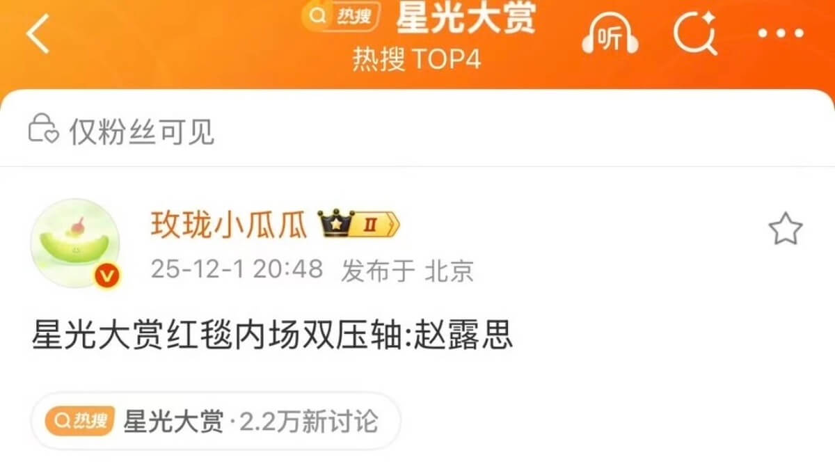 沒錯,一年一度的騰訊視頻星光大賞即將主辦,之前網傳了不少出席藝人名單,隨後有瓜主爆料,表示趙露思即會是紅毯和內場的雙壓軸!