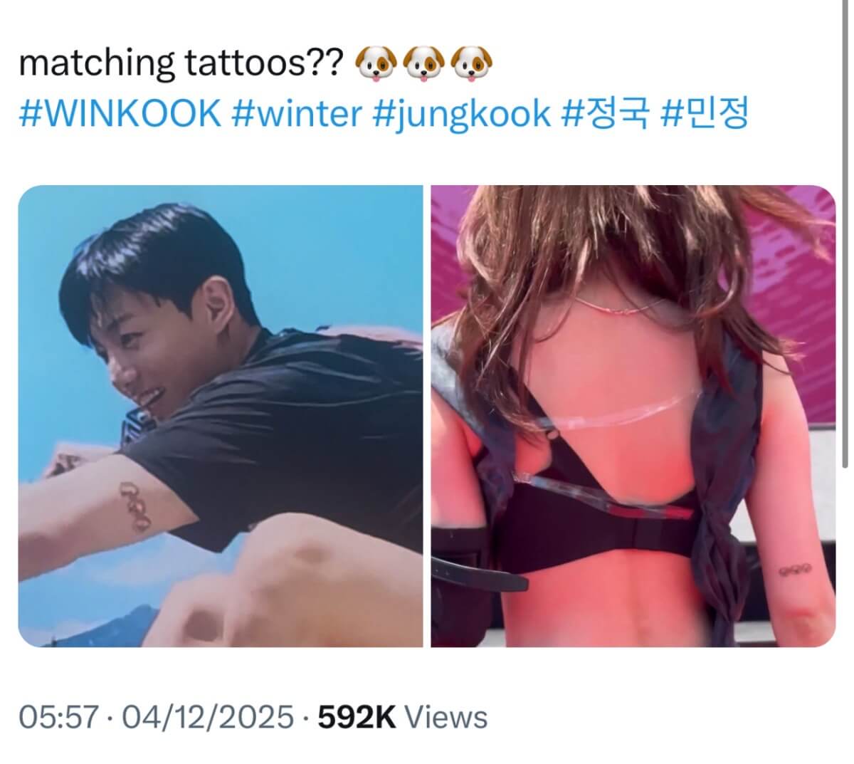 沒錯,4號這天韓網又有兩人相關討論,起因是有外國網友在X上,表示兩人紋了同款情侶紋身👇