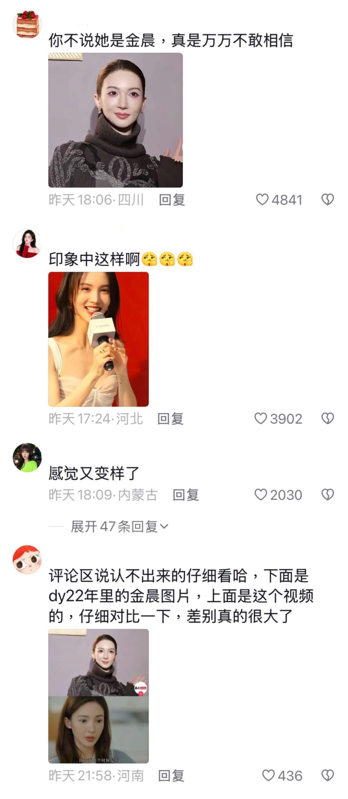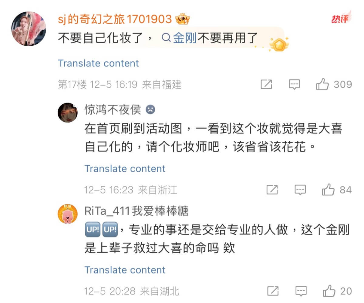 也有網友認為是妝容問題,因為這次活動的妝容,由金晨自己負責👇