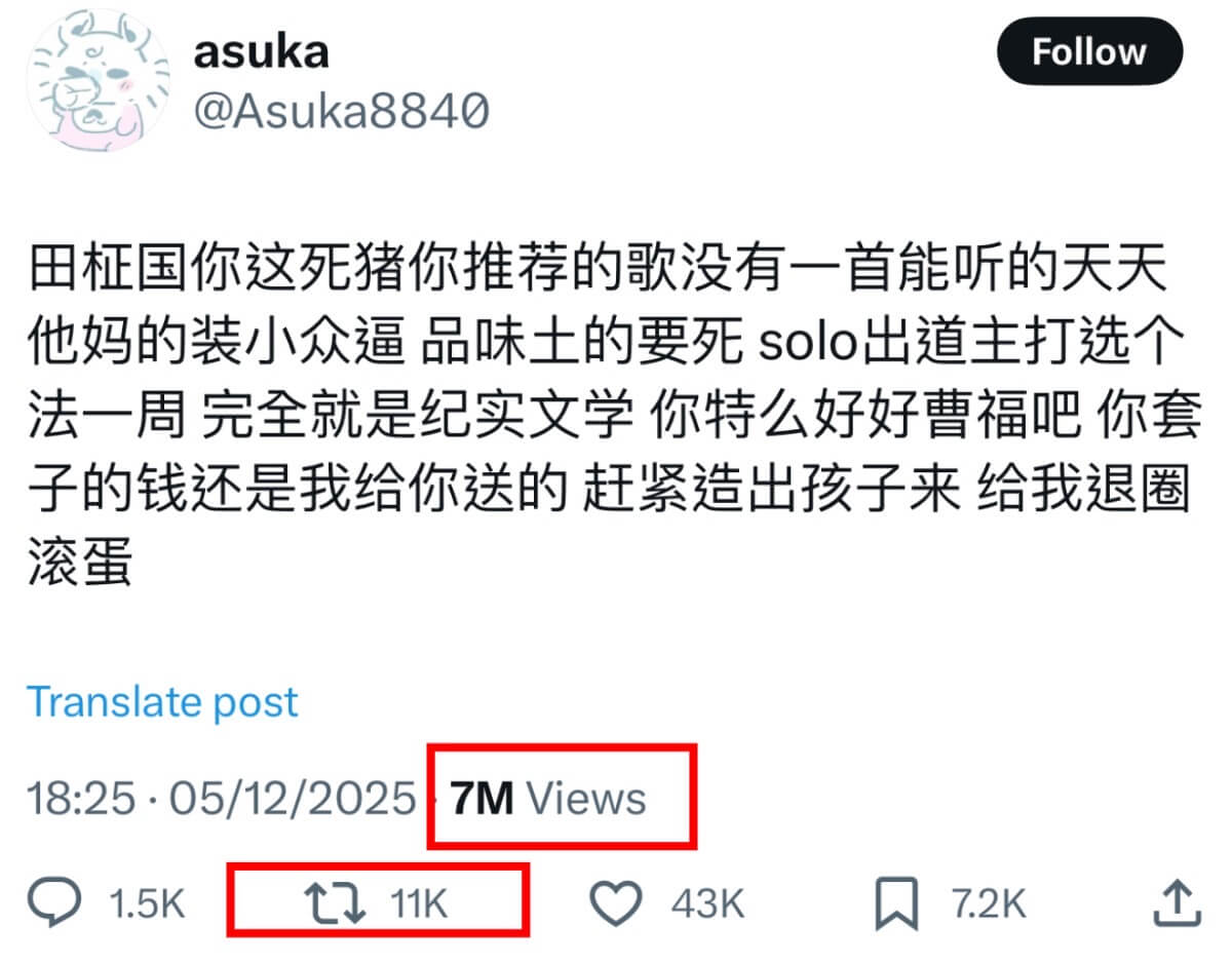 粉絲們的反應各不一,就有一名網友以中文在「x」平台發文,結果居然破了七百萬瀏覽,相當的出圈👇