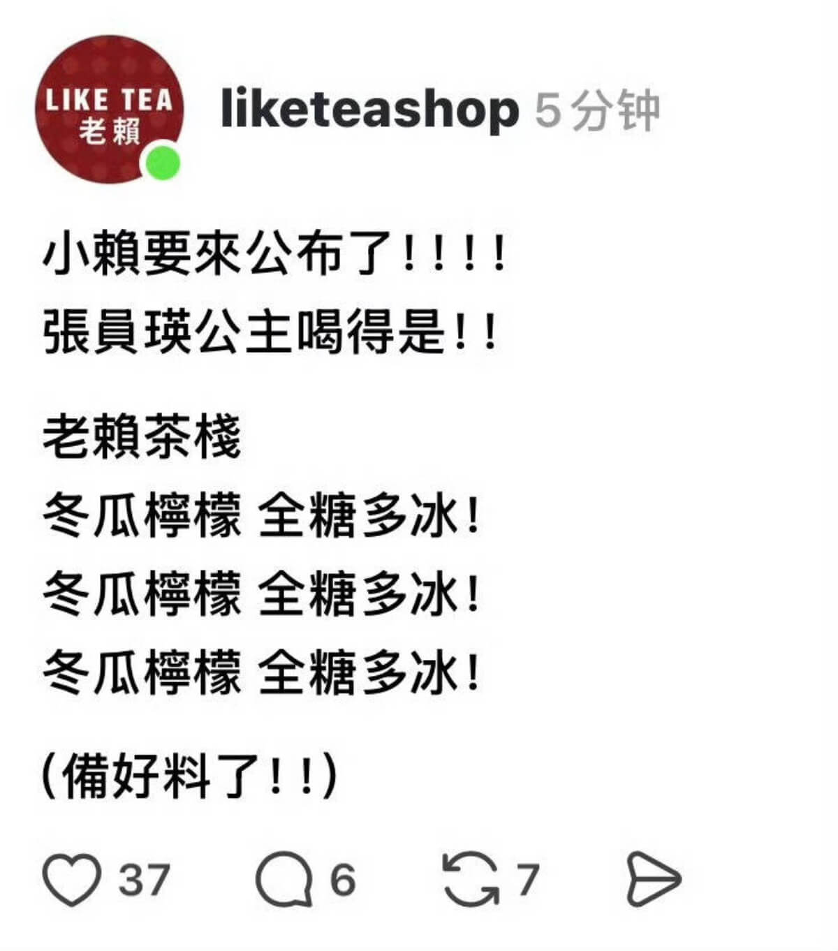 鏘鏘!熱心的店家這就公開答案來啦!原來她喝的是「冬瓜檸檬 全糖多冰」👇