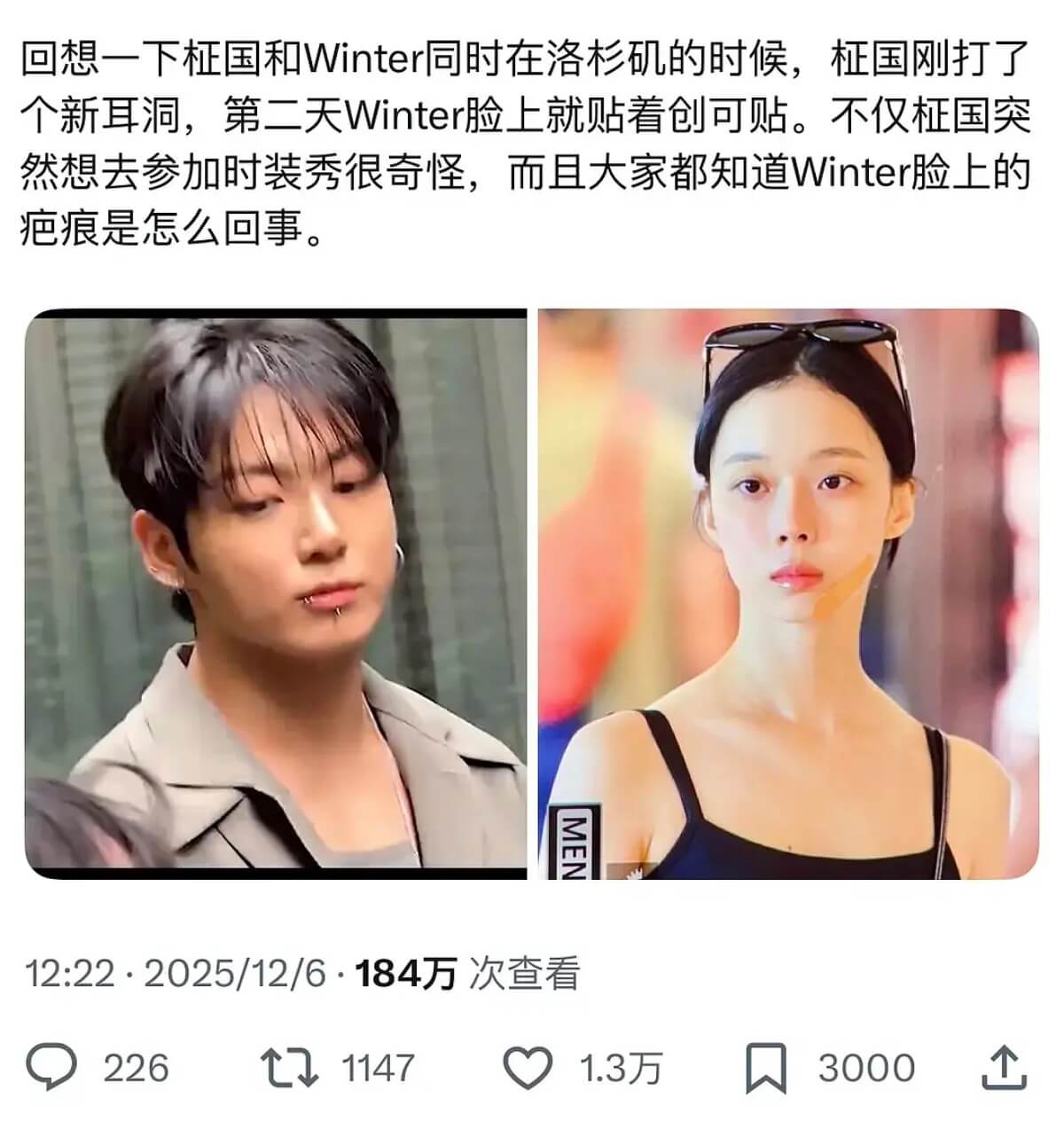 但在田柾國落地紐約之後,Winter回國時臉上居然貼了創可貼👇