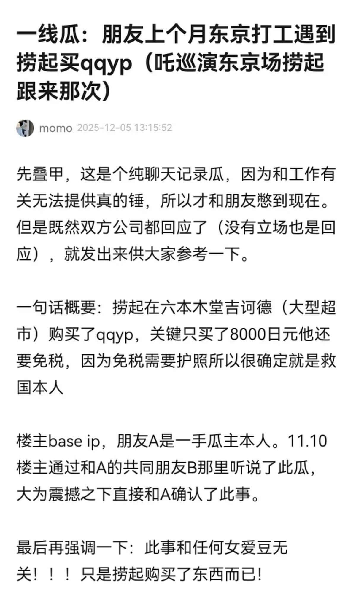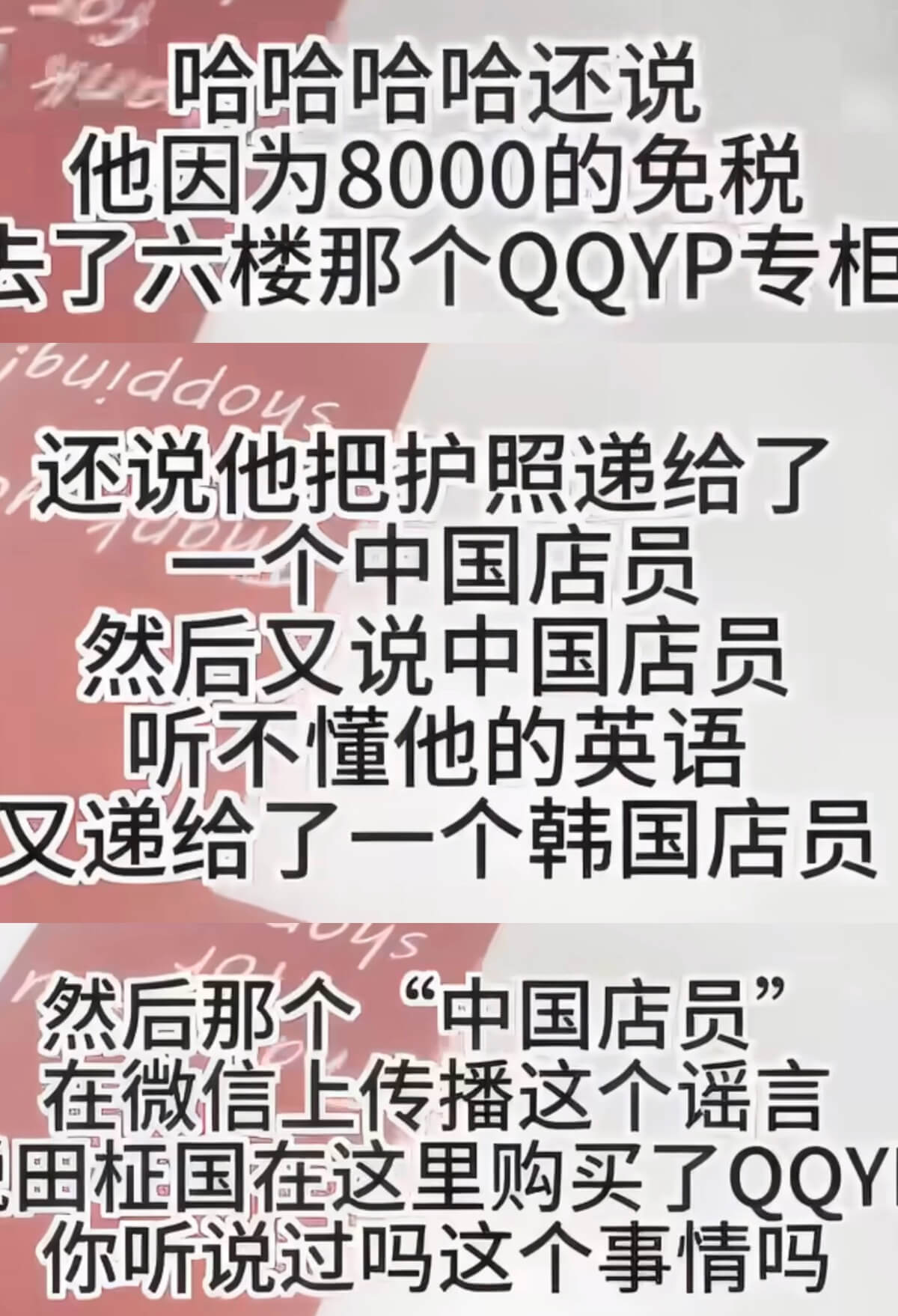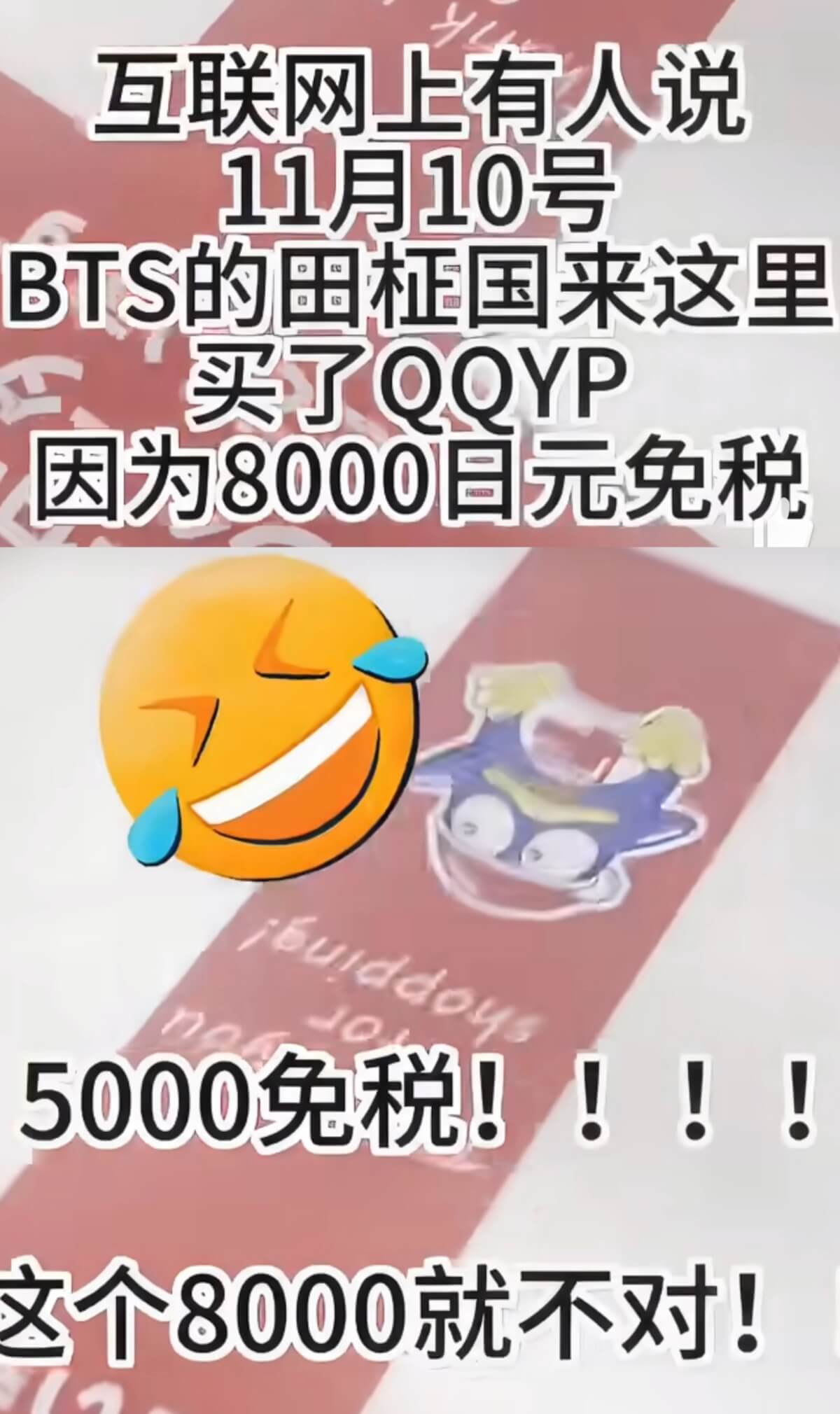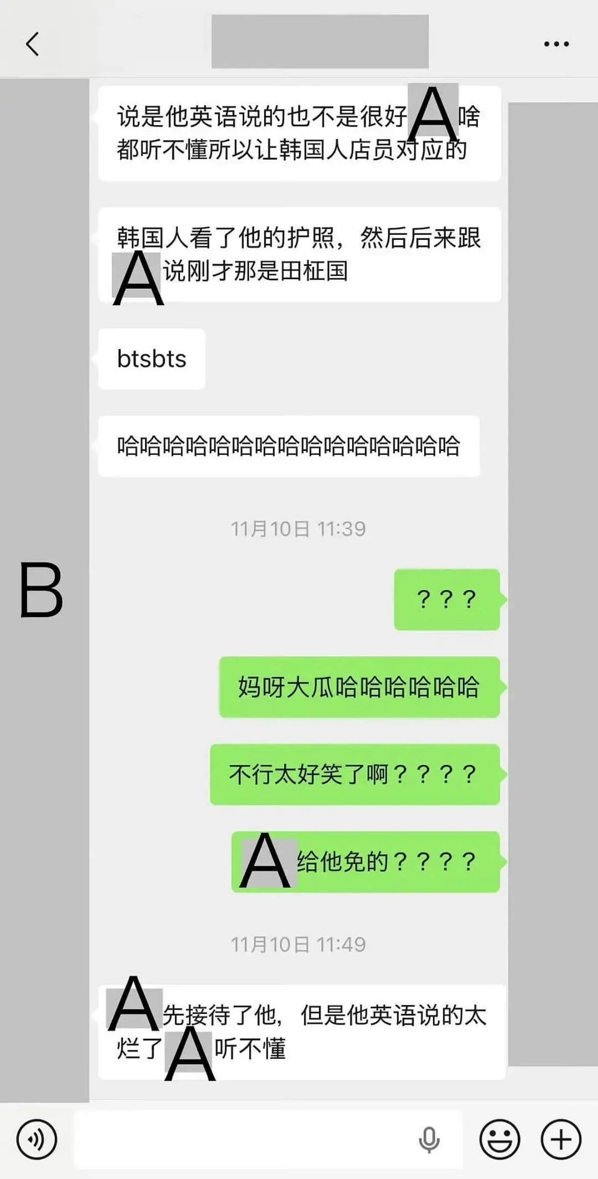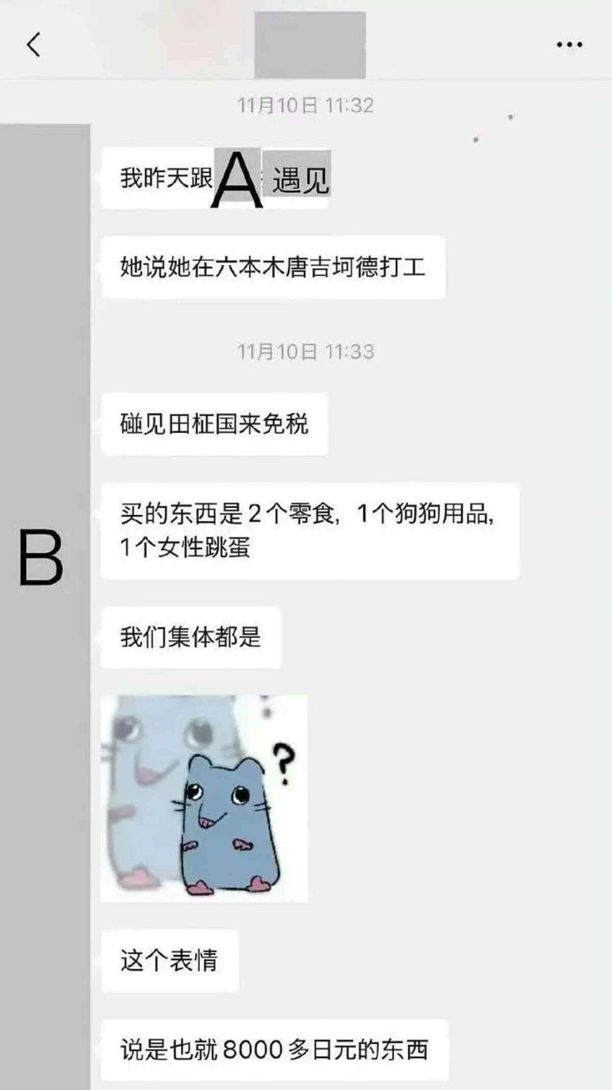 但還有更經典的發展來了!在爆出戀情之後,就有網友爆料,公開了自己和朋友在11月間的聊天,提到了田柾國當時去了東京六本木的唐吉訶德買情趣用品,隨後還為了退稅出示護照,才被店員認出來👇