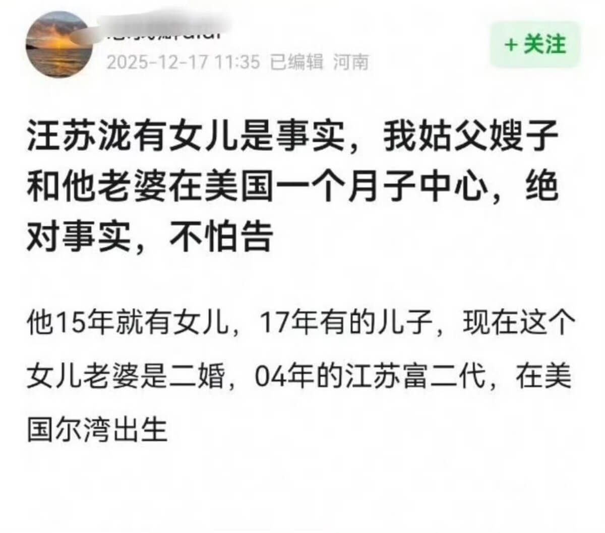 隨後就有網友爆料,自己姑夫的嫂子,在美國和汪蘇瀧太太同一個月子中心,汪蘇瀧早就有一子一女!