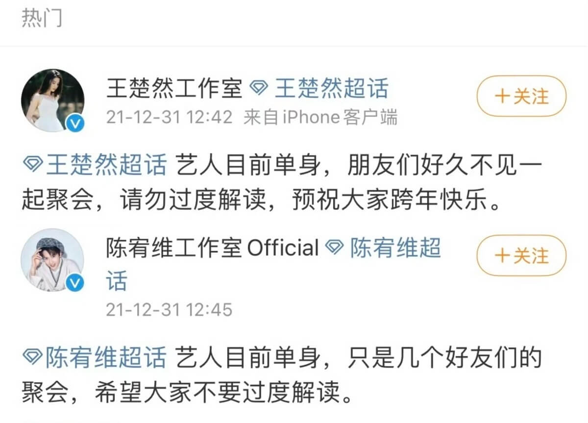 隨後雙方工作室發聲明闢謠,對比之下,這次爆戀情卻無任何回應👇
