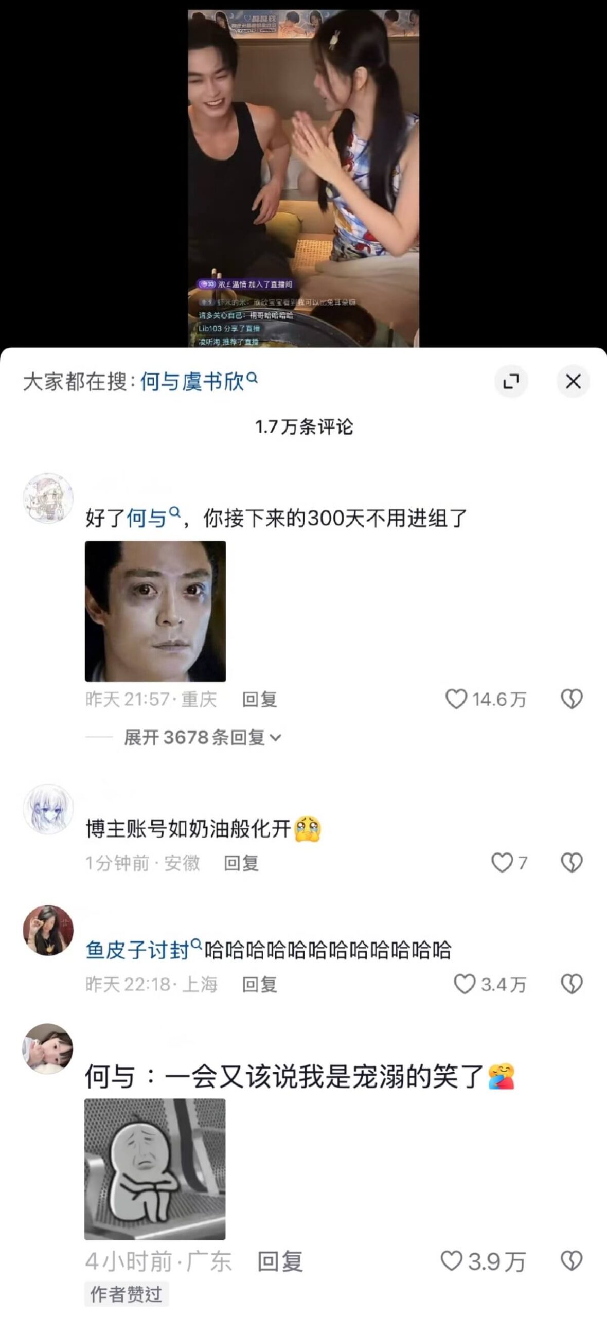 先是有網友表示,在玩遊戲環節中,何與被要求和虞書欣深情對視,說出三個對方吸引自己的優點👇