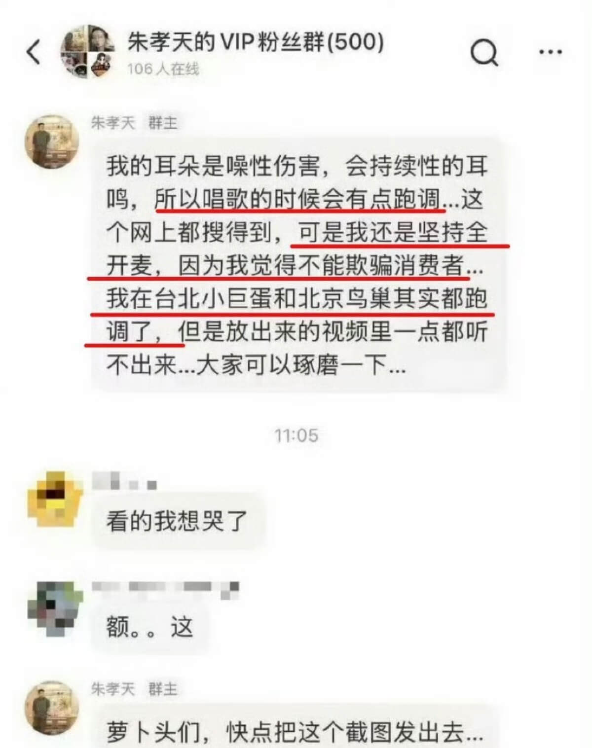 沒想到這樣的矛盾再次升級,朱孝天在自己的粉絲群再爆料,當中他自曝缺陷,表示自己耳朵有傷,唱歌一定會跑調,但他表示強調即便如此,自己也堅持全開麥真唱,因為「不能欺騙消費者」(這句話殺傷力滿分型)。